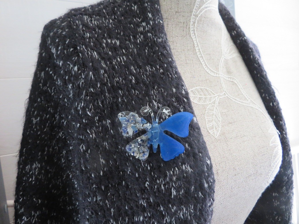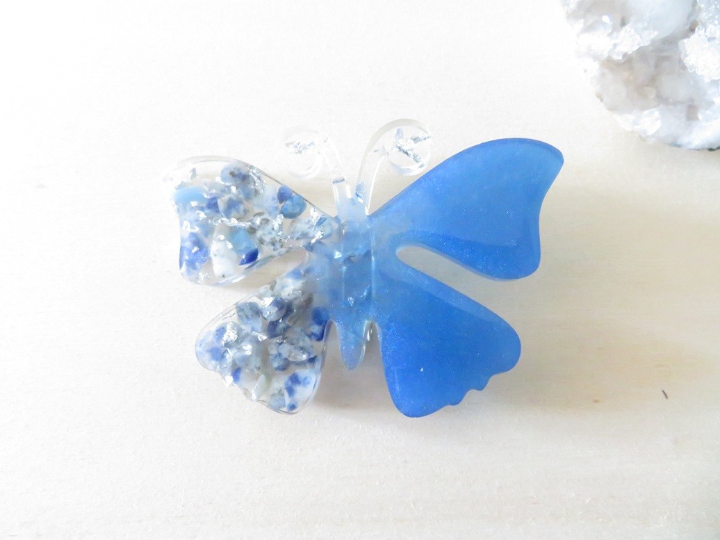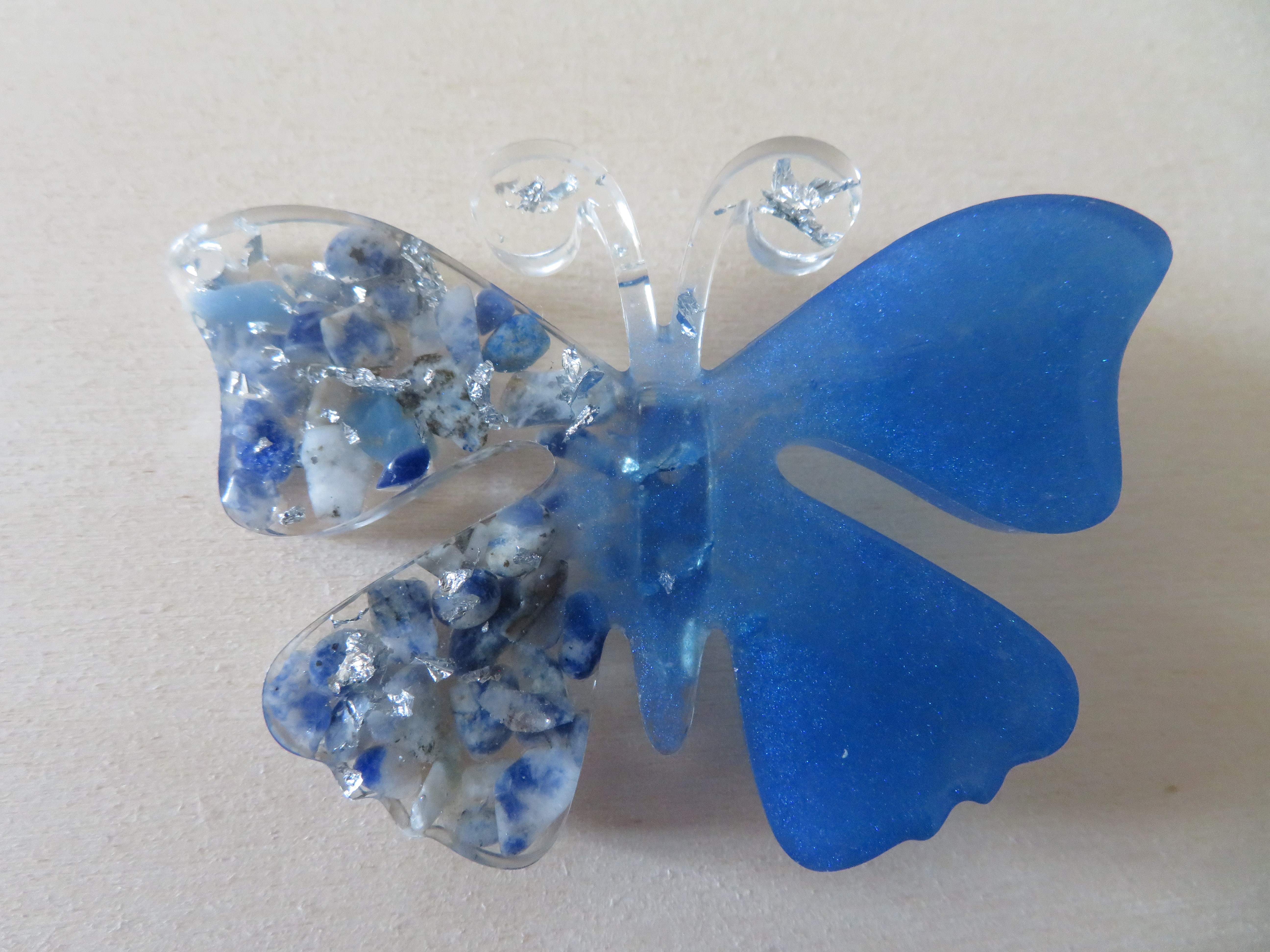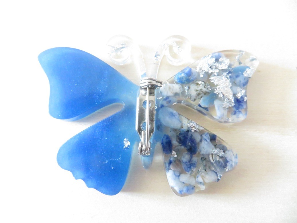 100% réalisé par mes soins, voici une belle broche « gros papillon » faite en résine bleu océan et incrusté de pierres naturelles Sodalite (graviers) et flocons argent. Cette broche fait 66 x 48 mm