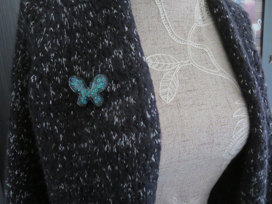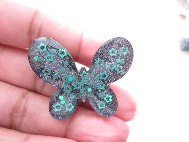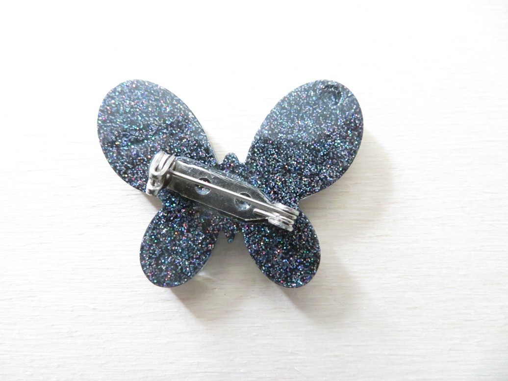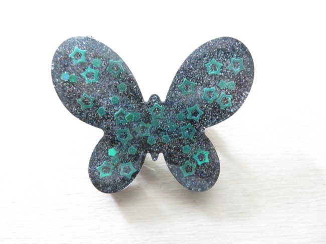 100% réalisé par mes soins, voici une belle broche « papillon » faite en résine à paillettes holographique noir et des petites étoiles irisées.