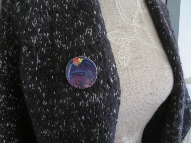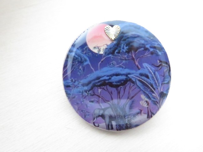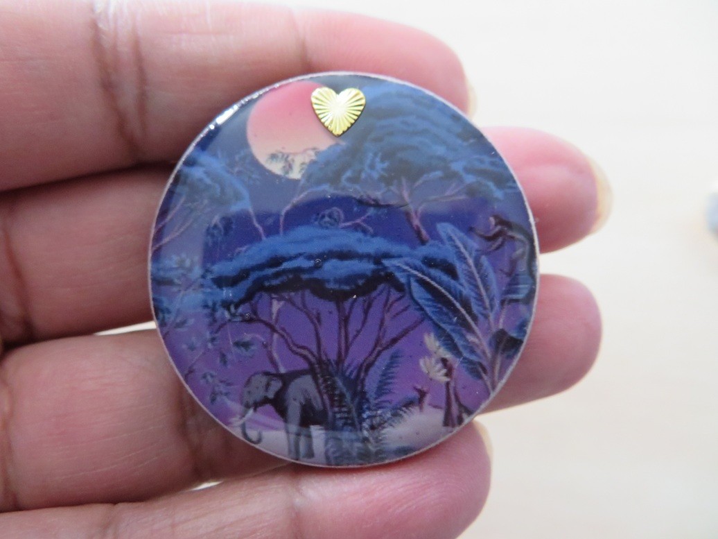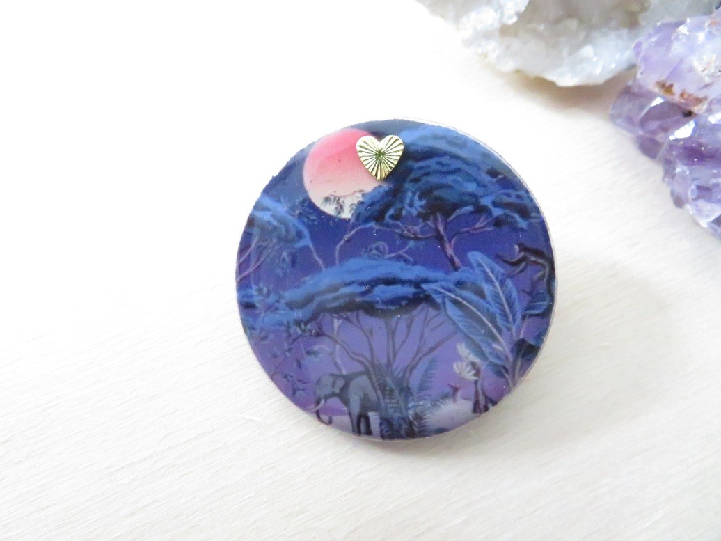 100% réalisé par mes soins, voici une belle broche faite en bois de tilleul et résine avec un beau motif de paysage et éléphant.