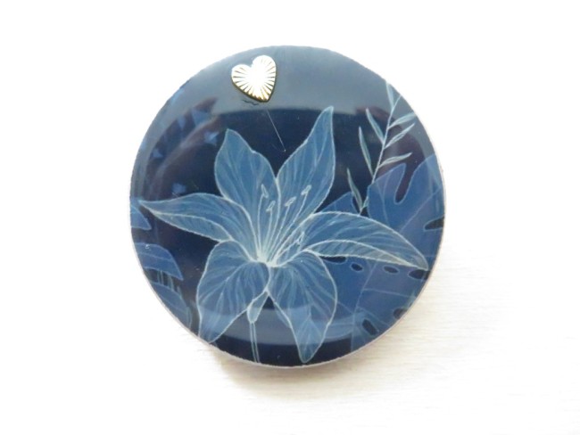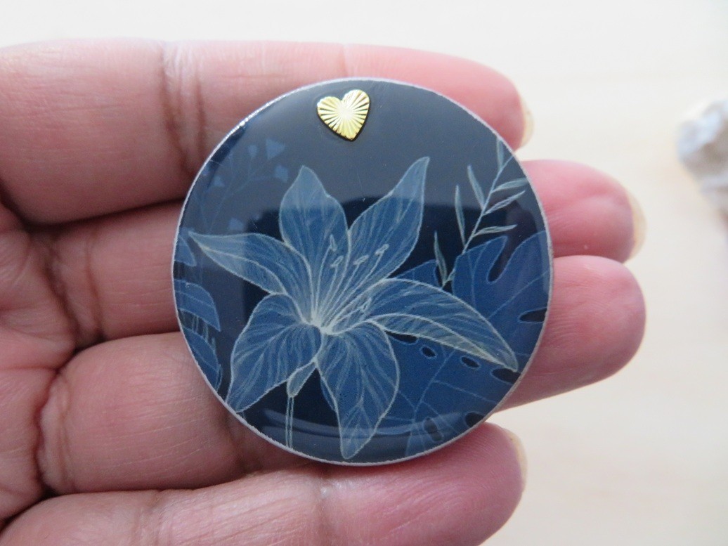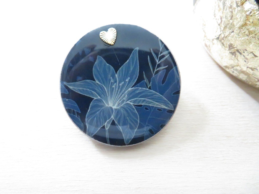 100% réalisé par mes soins, voici une belle broche faite en bois de tilleul et résine avec un beau motif de fleur or et bleu nuit.