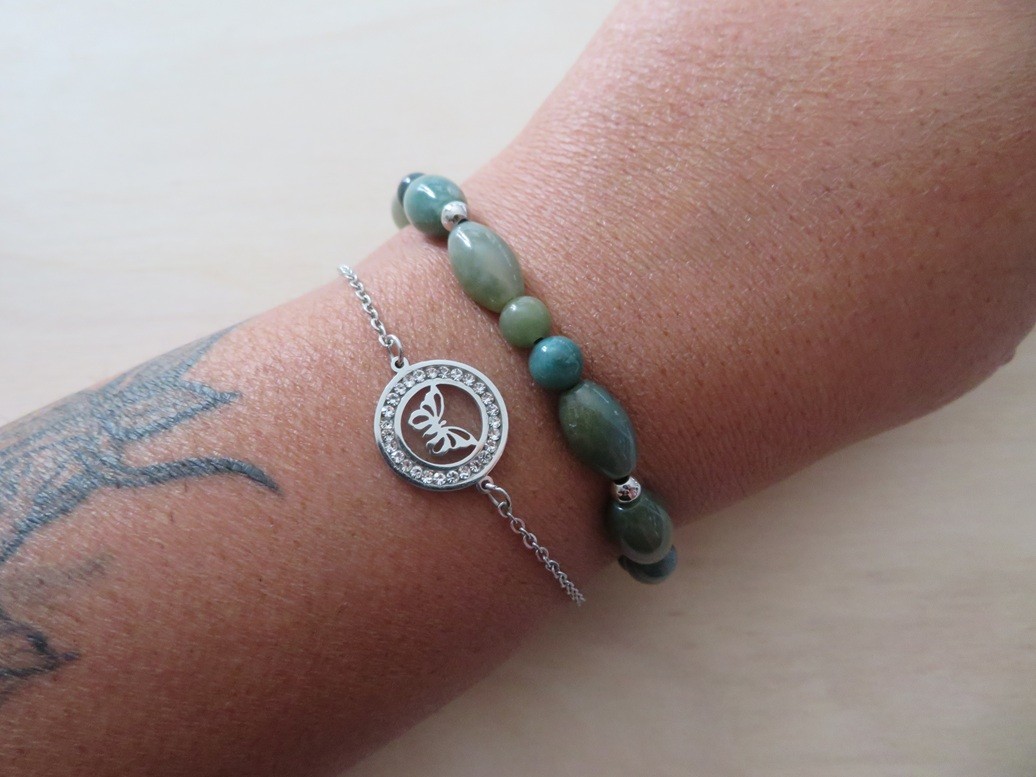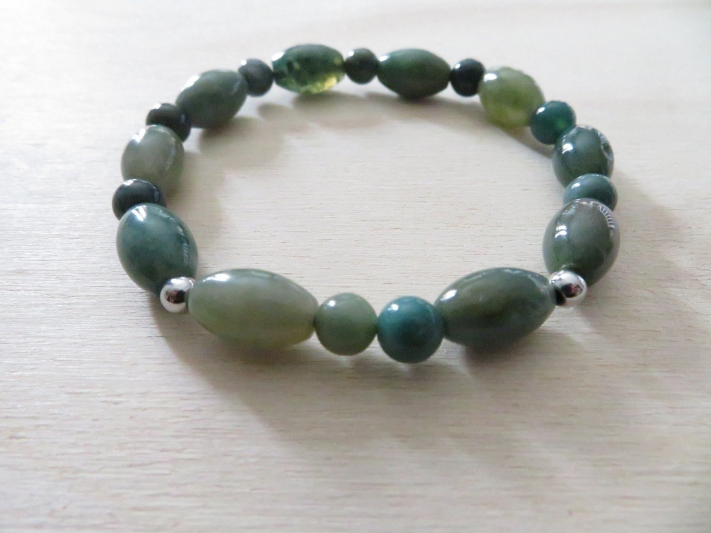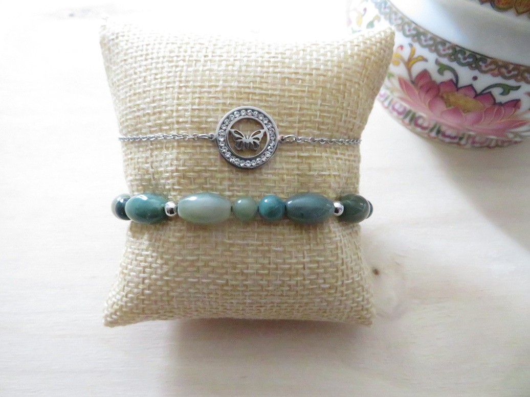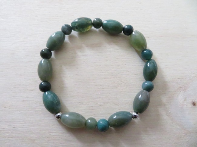 - 1 bracelet en pierres naturelles Agate indienne (forme olive et ronde) avec boules en acier inoxydable argent monté sur un fil élastique – merci de bien choisir, dans le menu déroulant, votre taille de bracelet souhaité