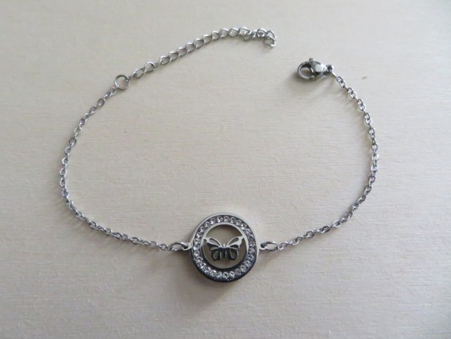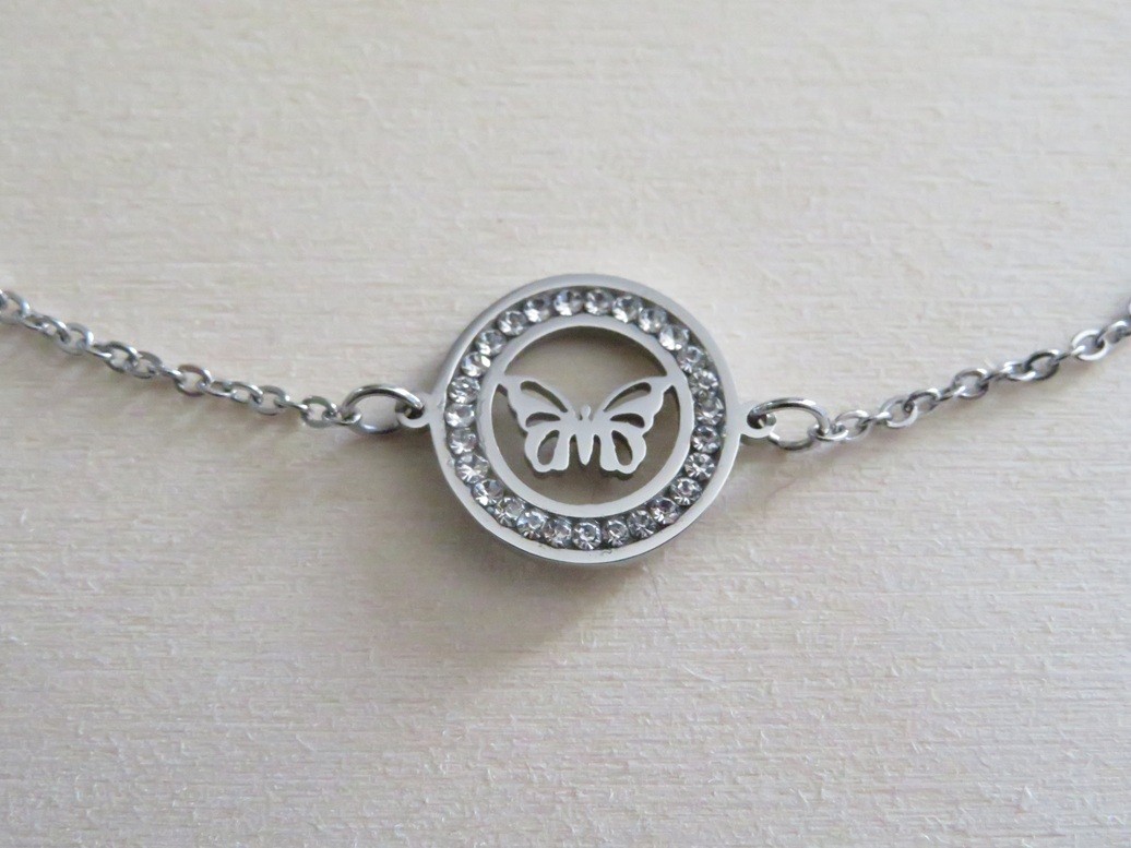 - 1 bracelet chaine avec un beau pendentif papillon en acier inoxydable argent et strass blanc – Bracelet réglable de 15,5 cm + 5 cm d’extension