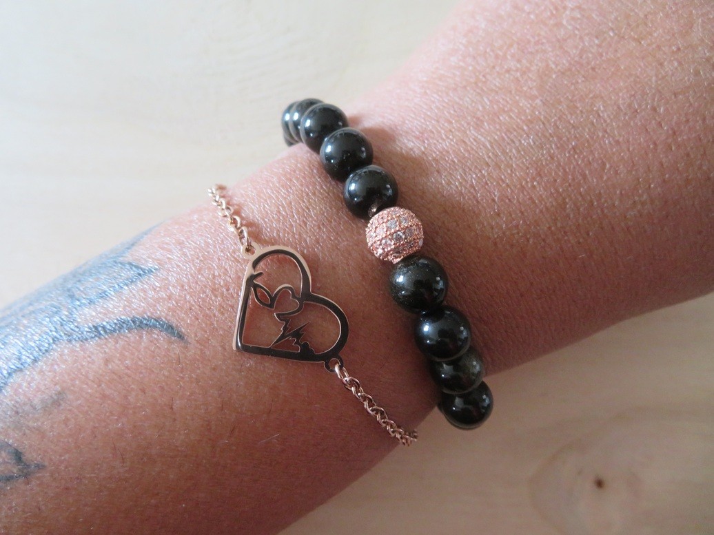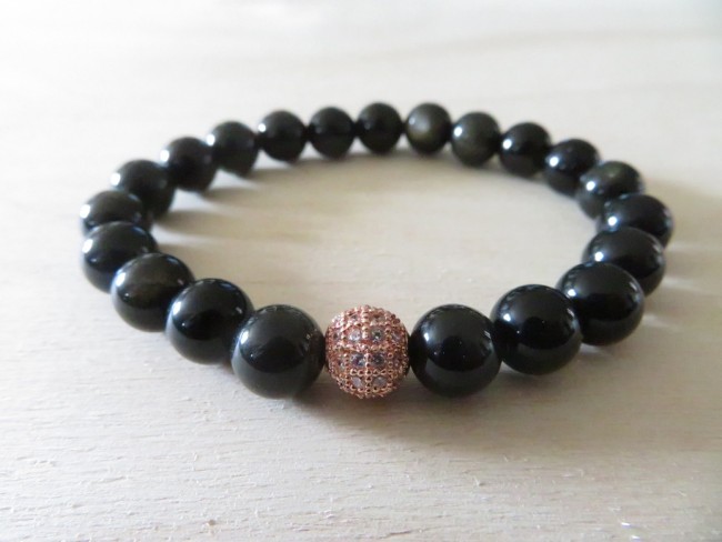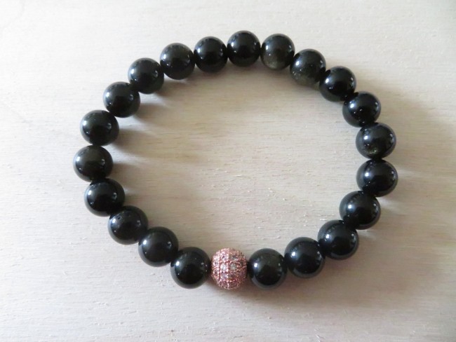 - 1 bracelet en pierres naturelles Obsidienne dorée 8 mm et boules or rose avec des strass blanc monté sur un fil élastique – merci de bien choisir, dans le menu déroulant, votre taille de bracelet souhaité
