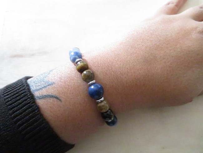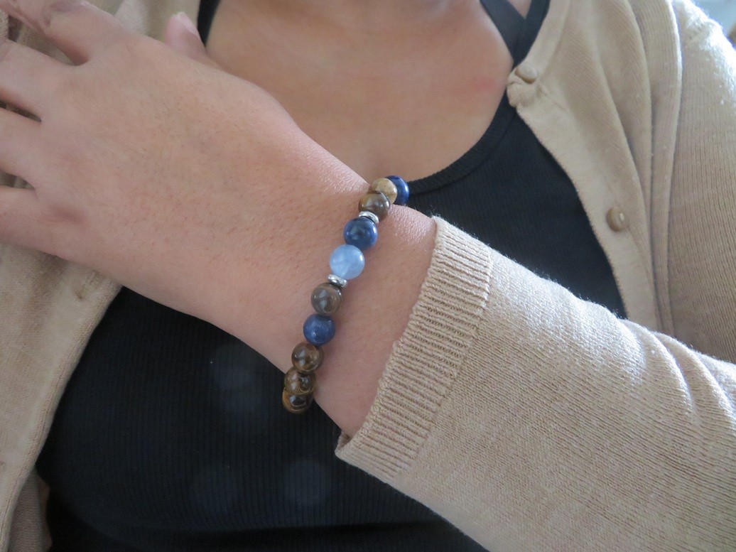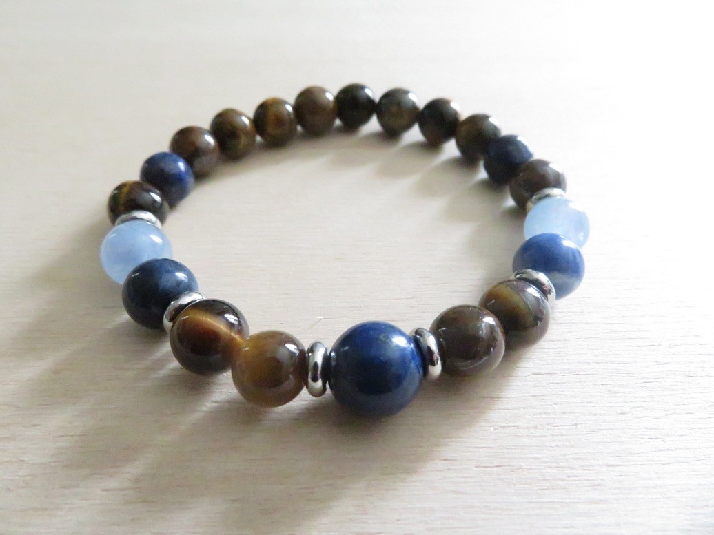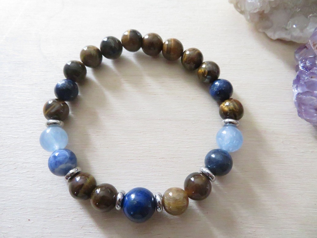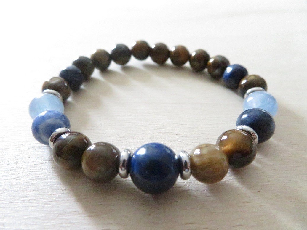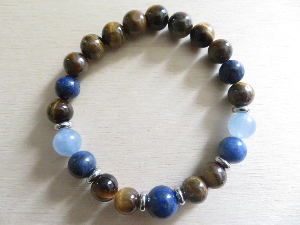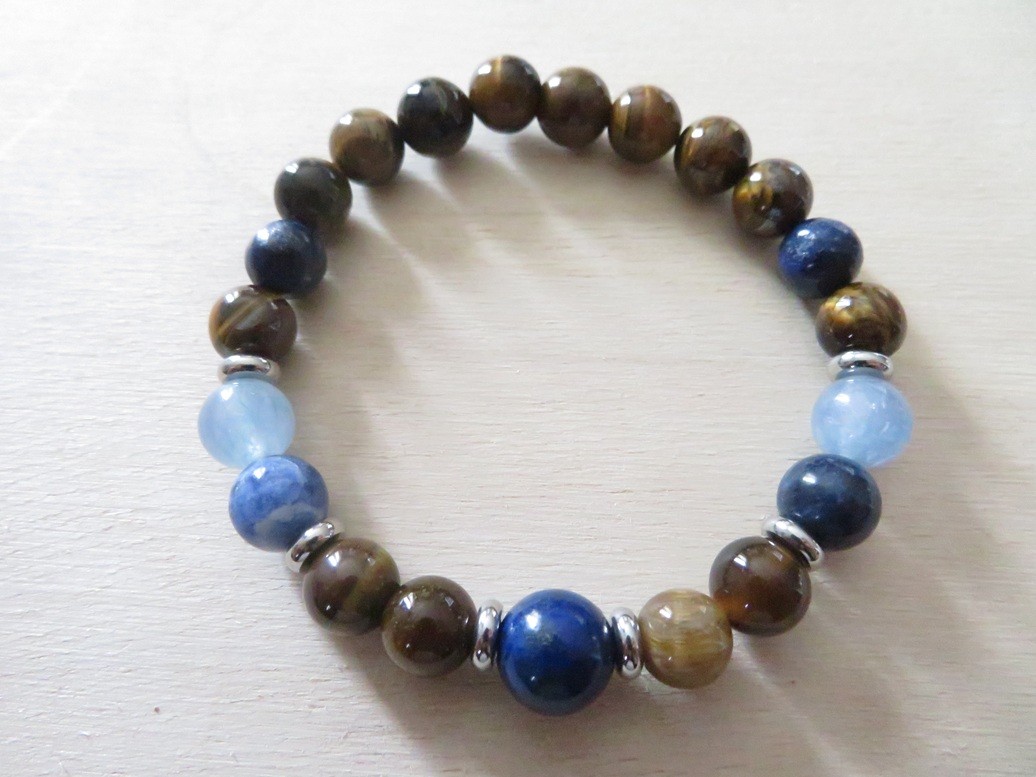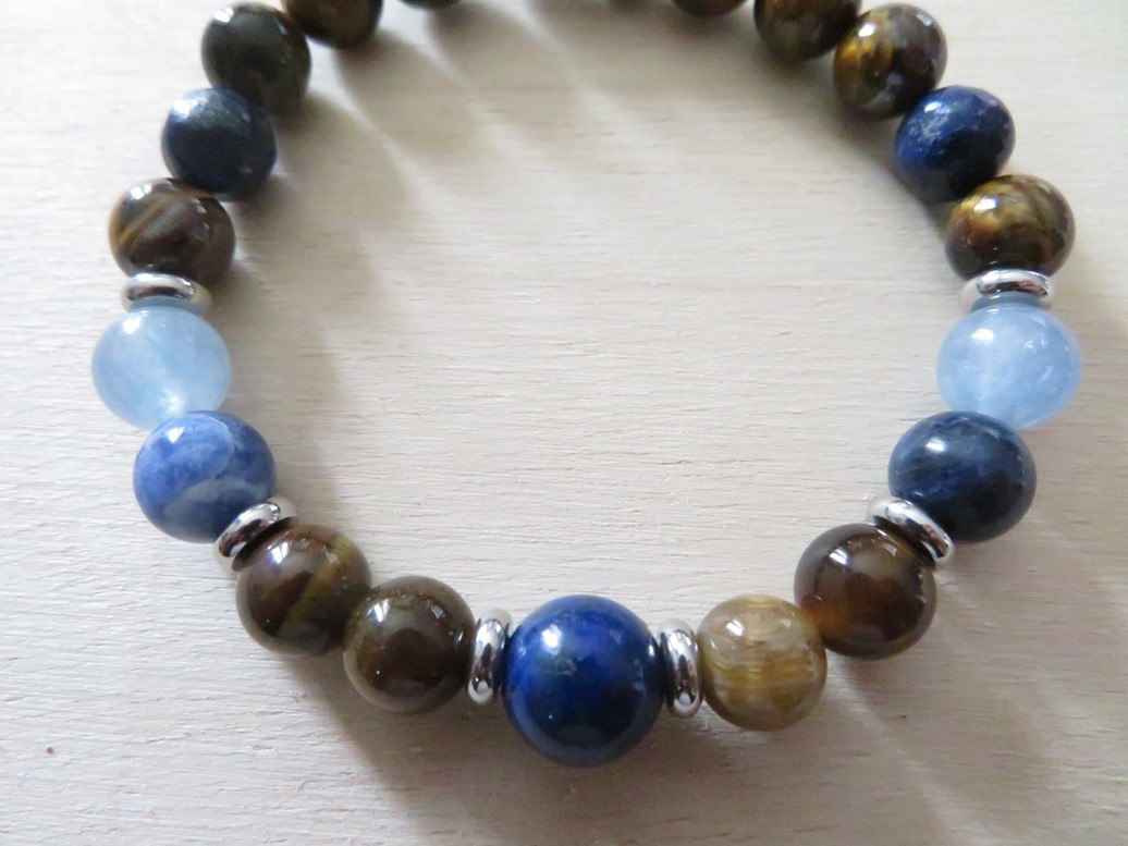 Bracelet en pierres naturelles Œil de tigre (8 mm), Aigue-marine (8 mm), Lapis lazuli (8 mm et 10 mm) et Sodalite (8 mm) avec entretoises en acier inoxydable argent