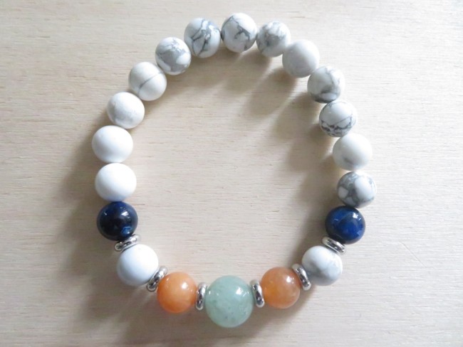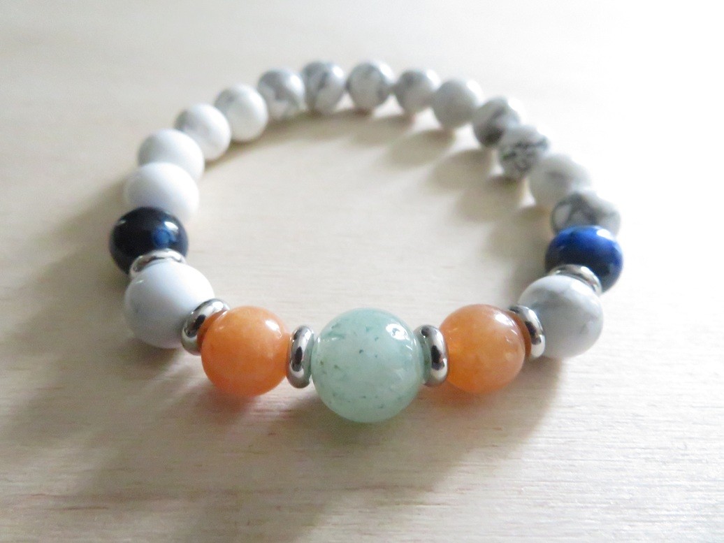 Bracelet en pierres naturelles Howlite blanche (8 mm), Œil de tigre bleu (8 mm), Aventurine orange (8 mm) et Aventurine verte (10 mm) avec entretoises en acier inoxydable argent monté sur un fil stretch