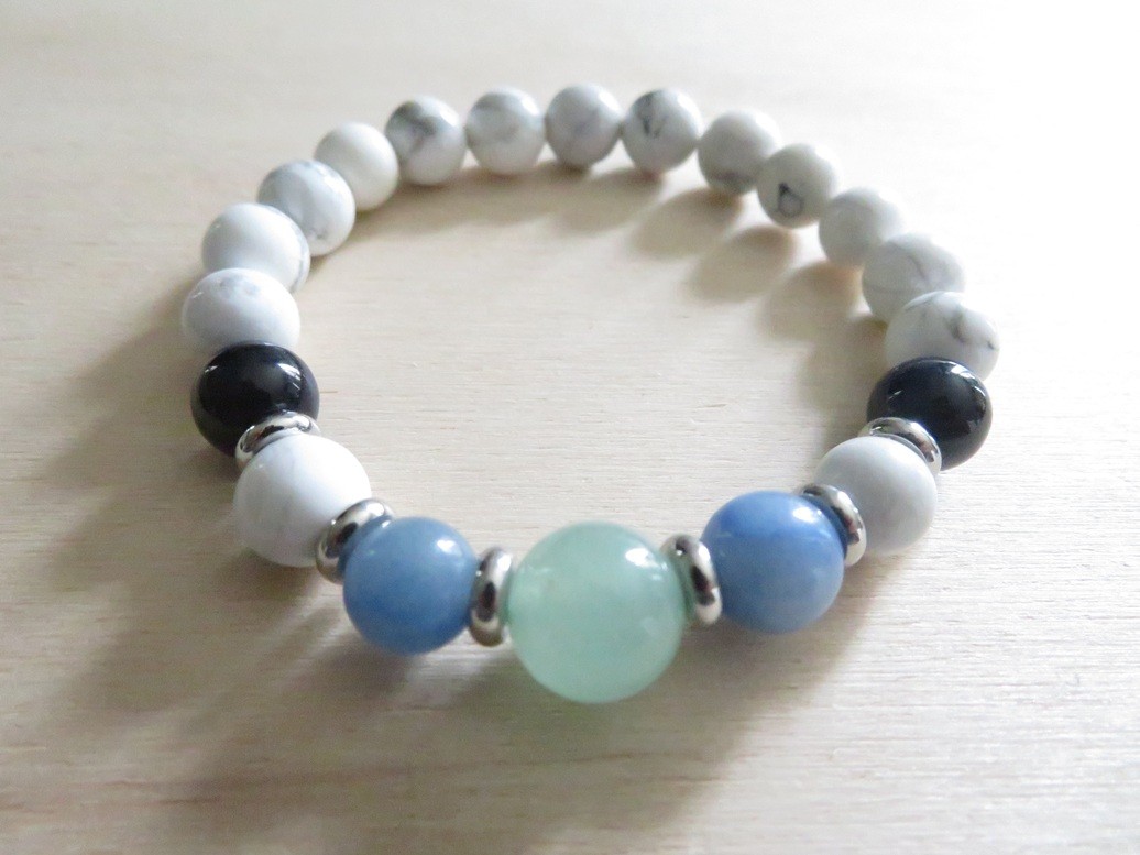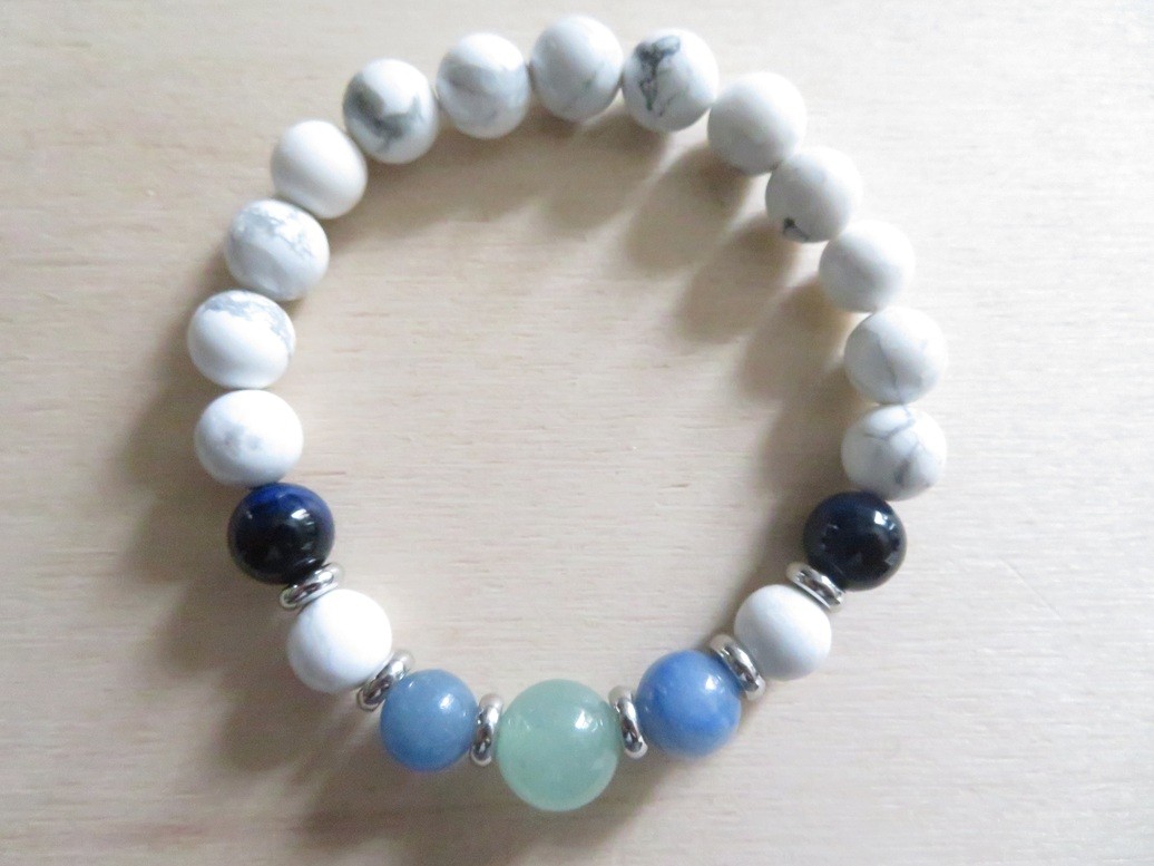 Bracelet en pierres naturelles Howlite blanche (8 mm), Œil de tigre bleu (8 mm), Aventurine bleue (8 mm) et Aventurine verte (10 mm) avec entretoises en acier inoxydable argent monté sur un fil stretch
