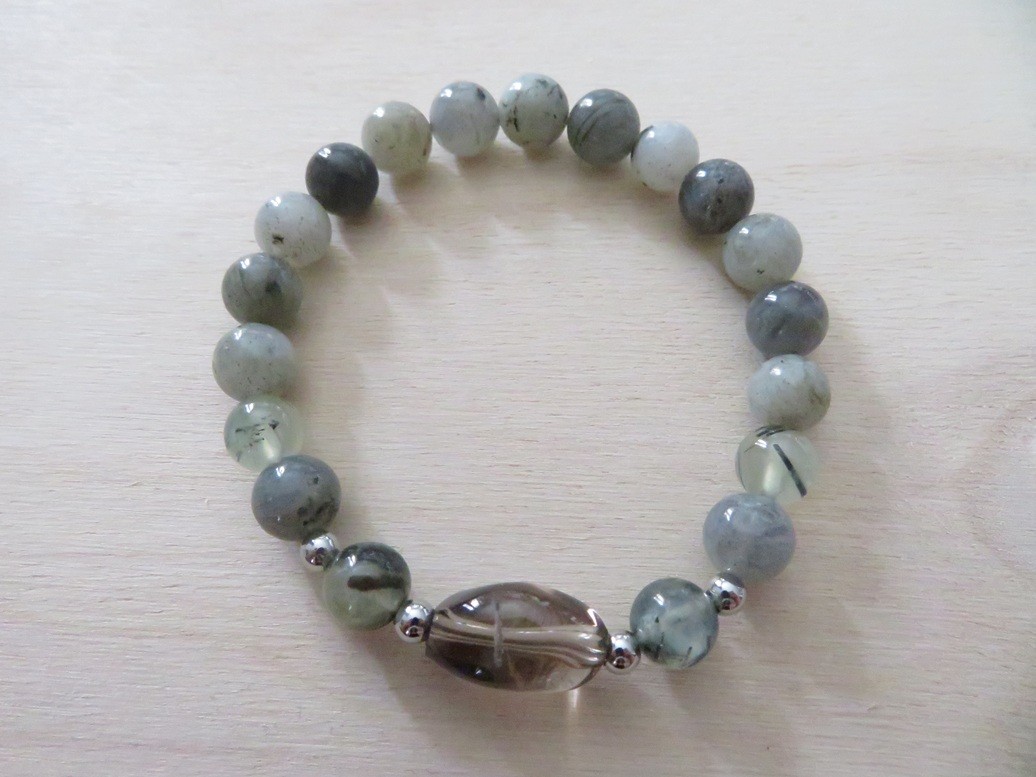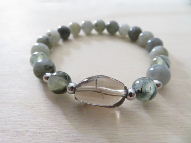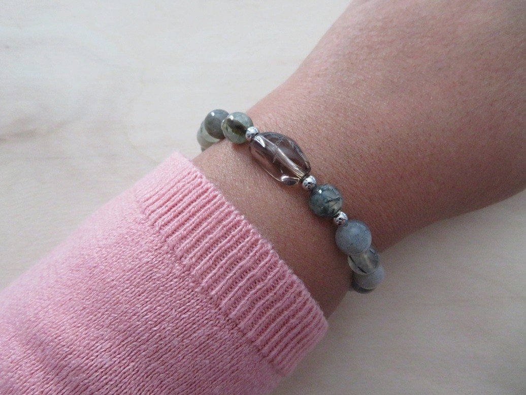 Bracelet en pierres naturelles Labradorite (8 mm), Prehnite (8 mm) et Quartz fumé (baroque) avec boules en acier inoxydable argent monté sur un fil stretch