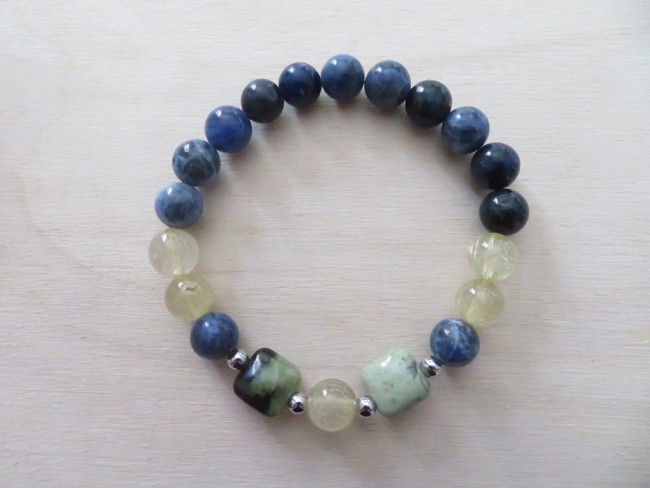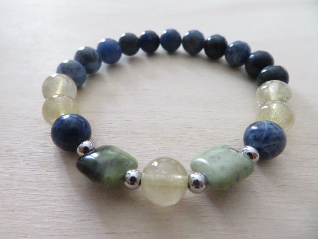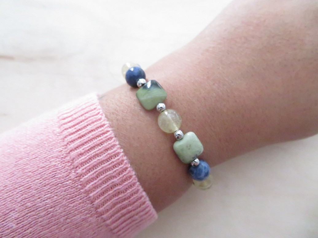 Bracelet en pierres naturelles Sodalite (8 mm), Quartz rutile (8 mm) et Serpentine (carré) avec boules en acier inoxydable argent monté sur un fil stretch