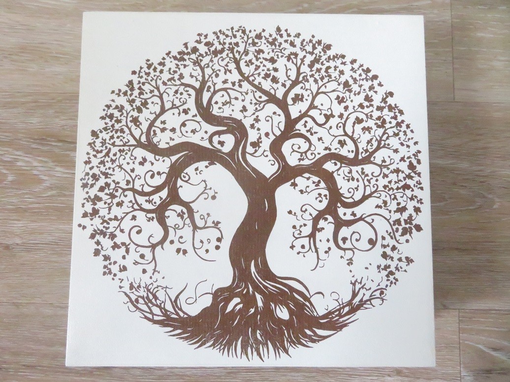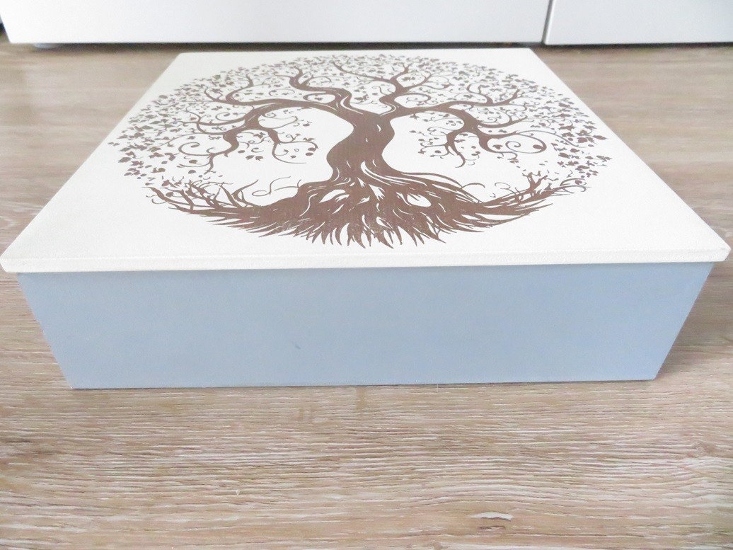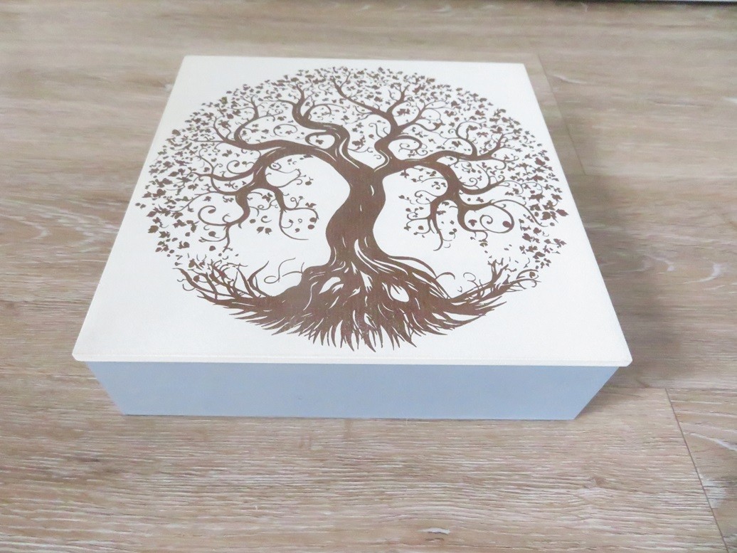 Boite de rangement en bois avec 9 compartiments, peinte à la main en blanc pour le couvercle avec une très belle gravure Arbre de vie