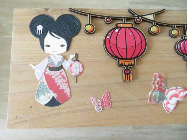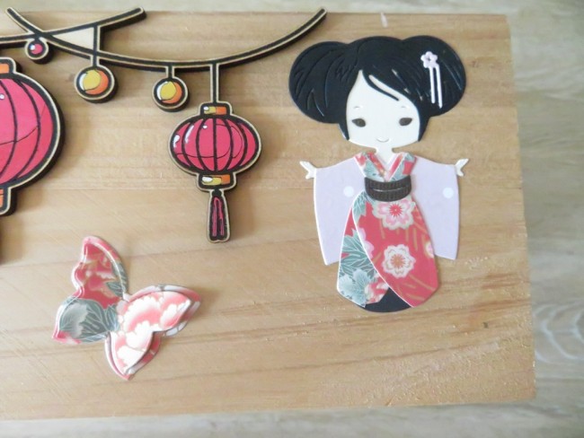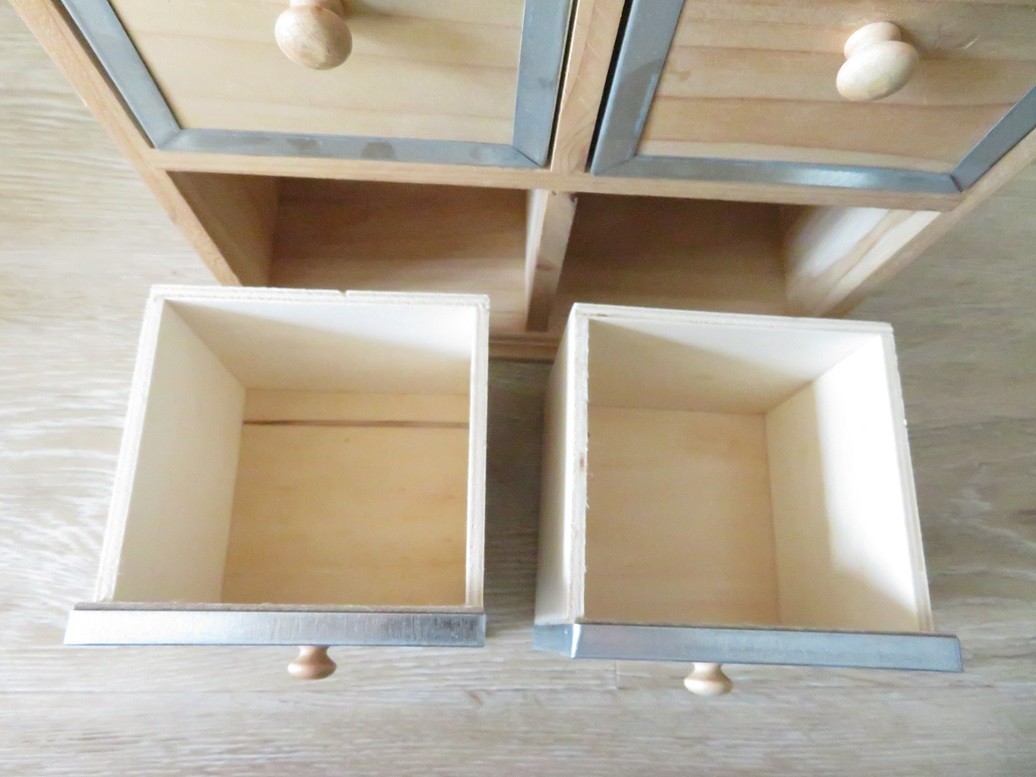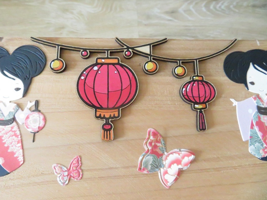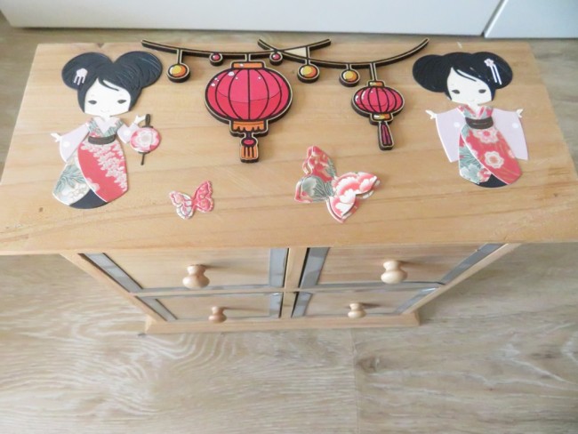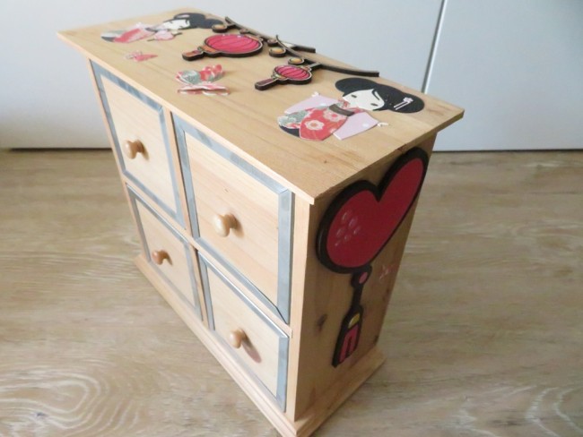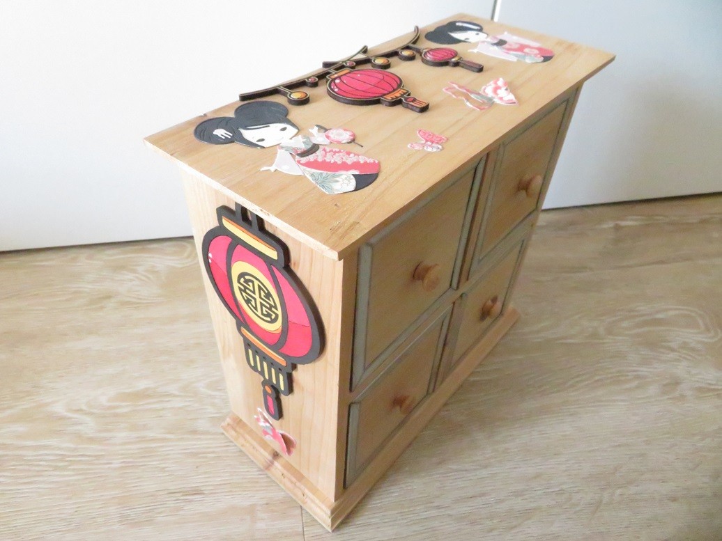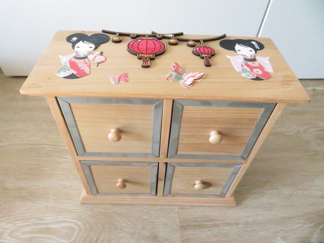 Mini commode en bois 4 tiroirs, décoration faite sur le thème du Japon (poupées, lampions…)