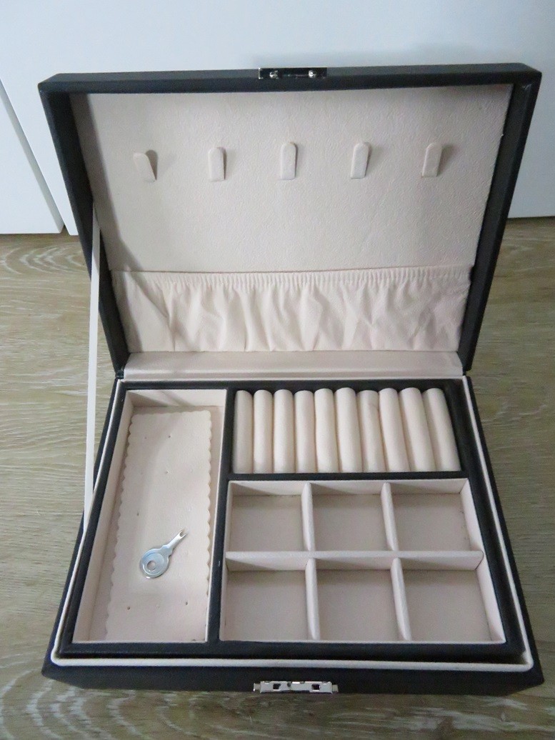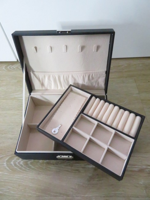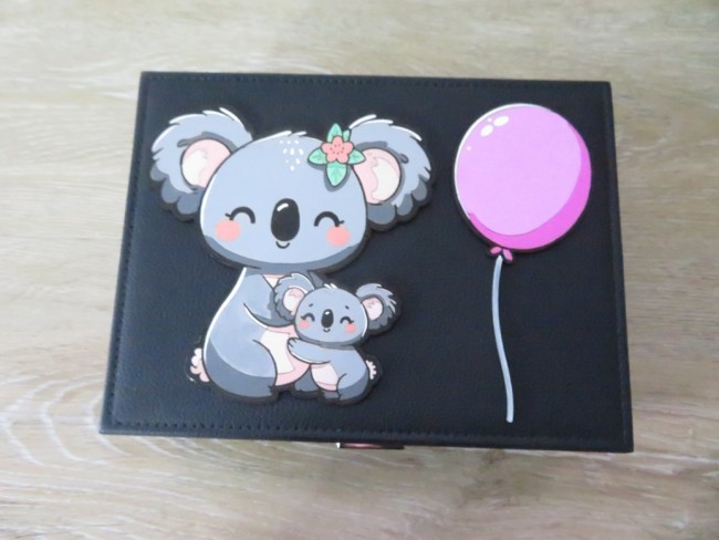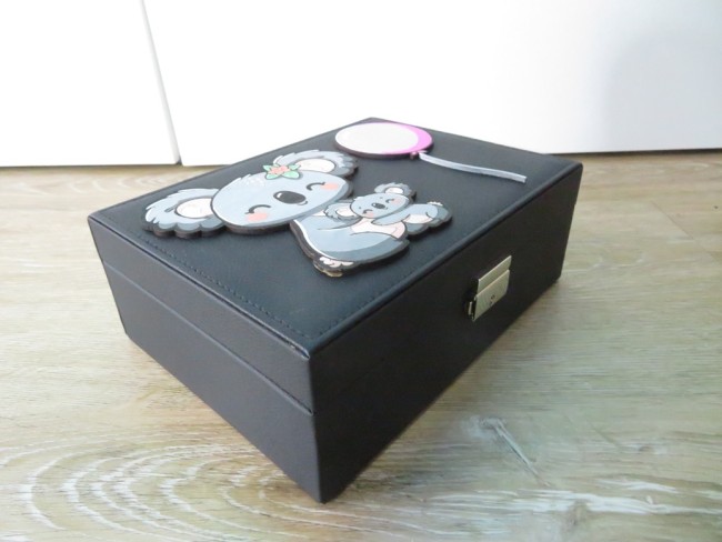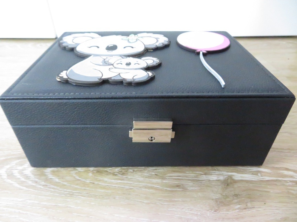 Grande boite à bijoux noir avec une jolie décoration de Koalas et ballon peints à la main. Cette grande boite à bijoux comporte plusieurs compartiments pour y ranger pas mal de bijoux – Cette boite à bijoux s’ouvre ou se ferme à clés