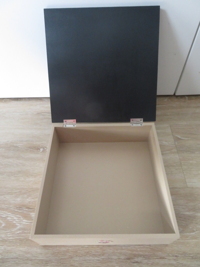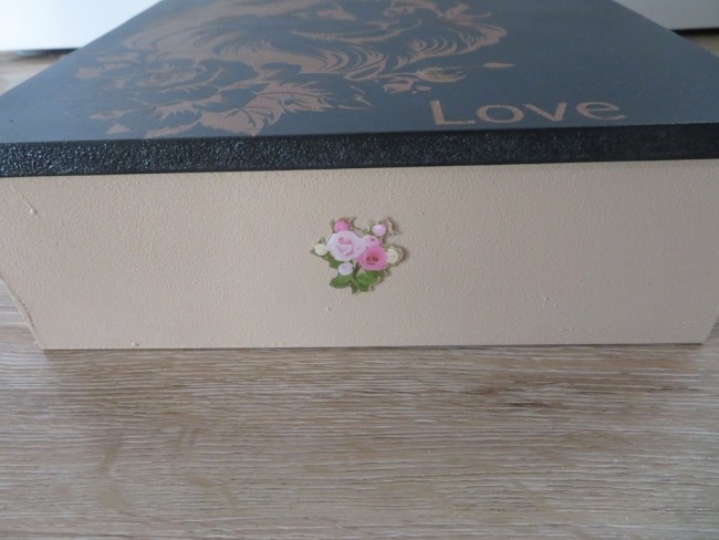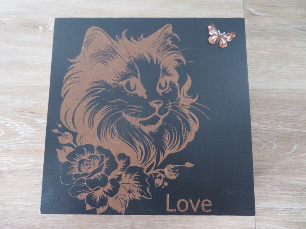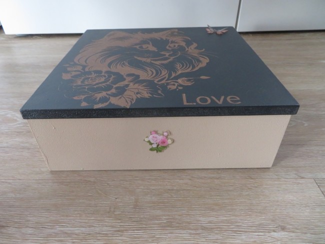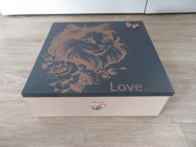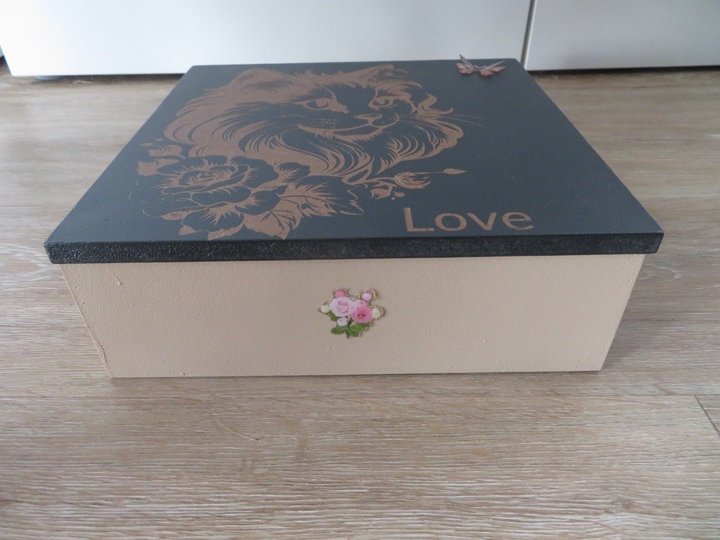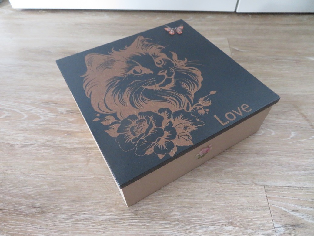 Grande boite de rangement en bois, peinte à la main en noir et moka avec une très belle gravure chat fleuri