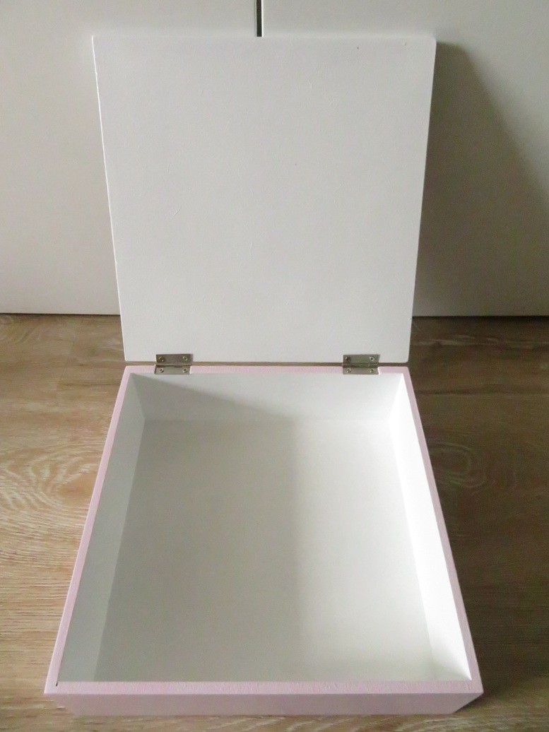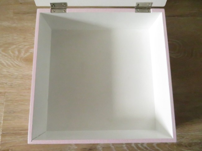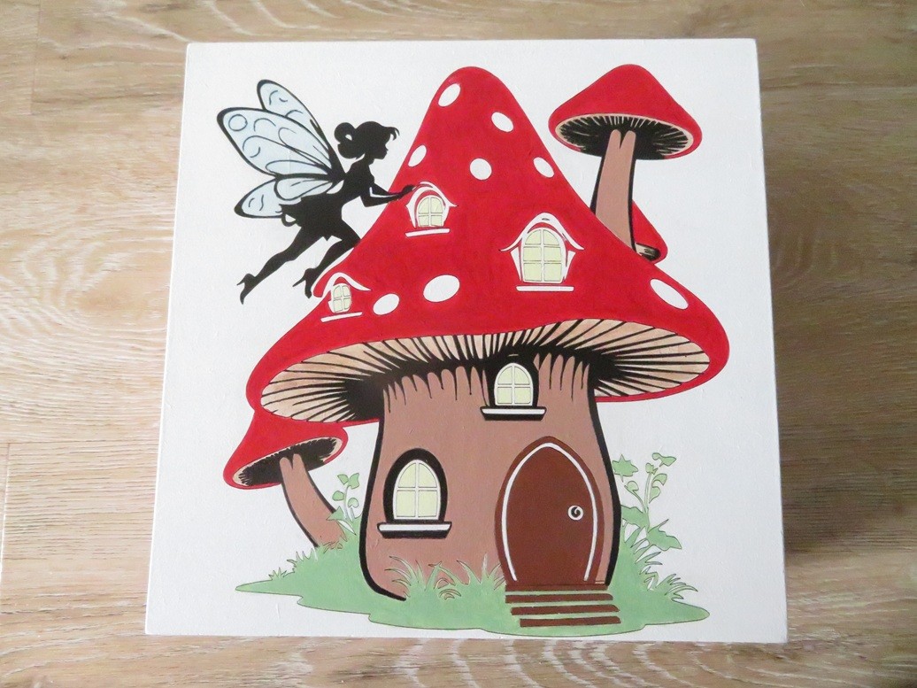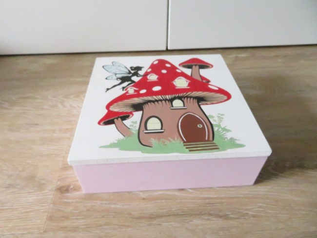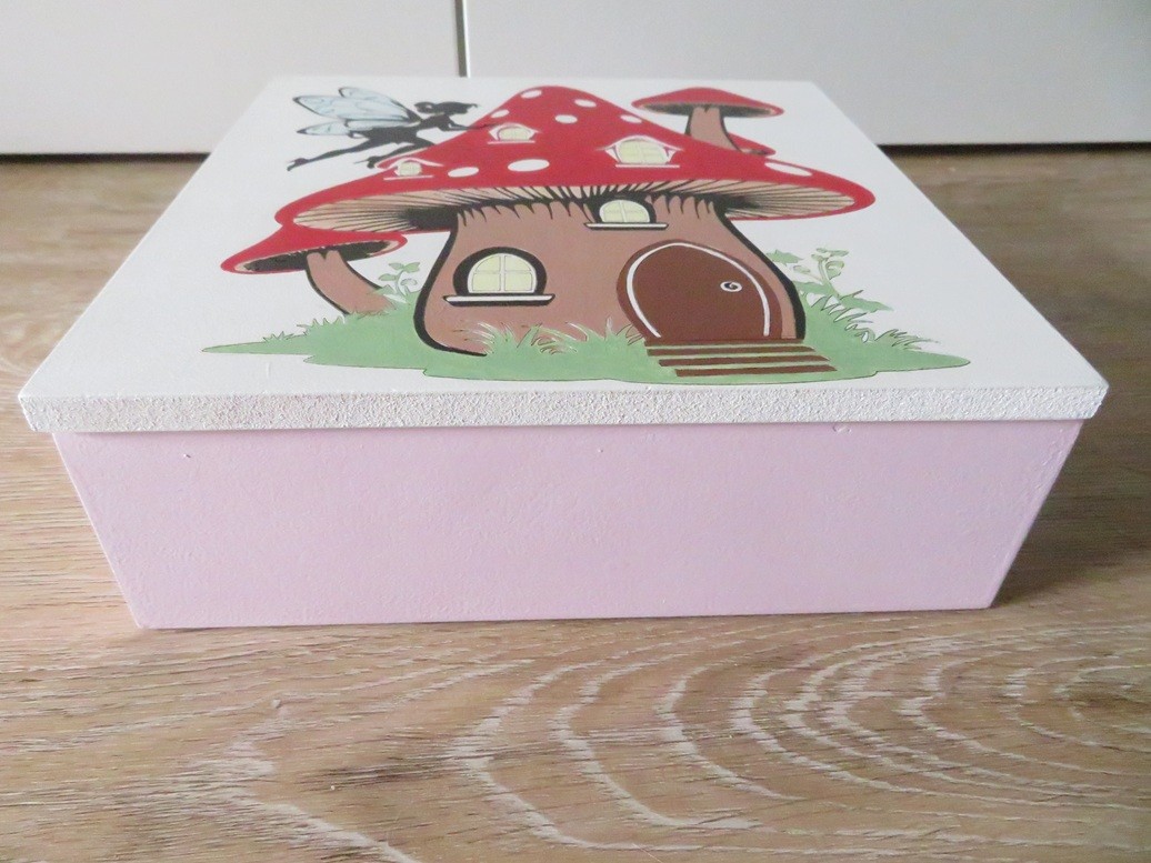 Boite de rangement en bois, peinte à la main en blanc et rose clair avec un beau décor féerique, champignon, fée