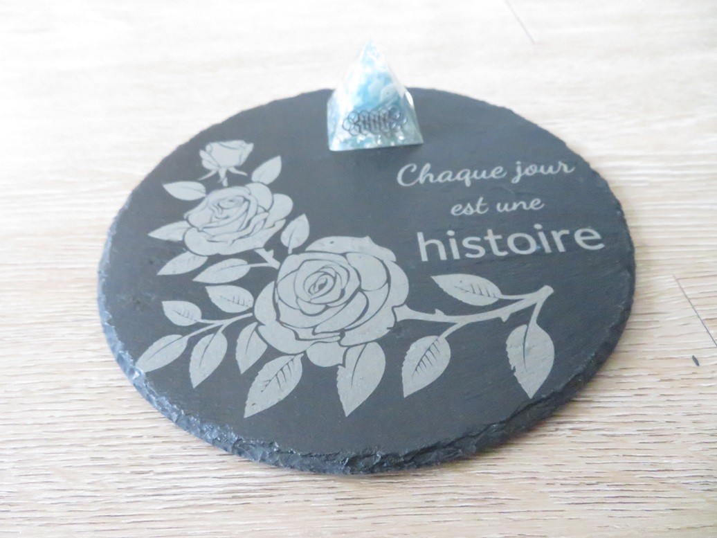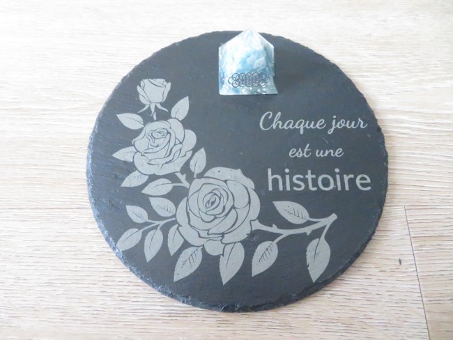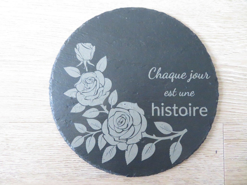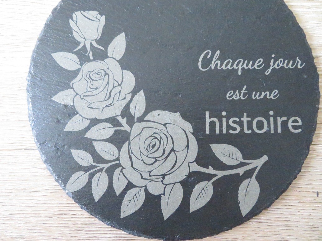 Plaque en ardoise ronde avec une jolie gravure roses et une belle citation « Chaque jour est une histoire » – Dimension de l’ardoise : 20 cm