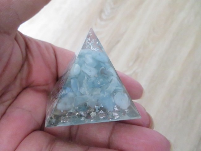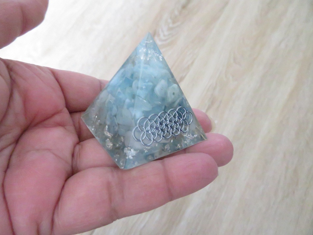 Très belle petite Orgonite en forme de pyramide « 100% fait main » composé de résine, de pierres naturelles aigue-marine, flocons argent symbole sacré fleur de vie – dimension de la pyramide : 4,5 x 4cm