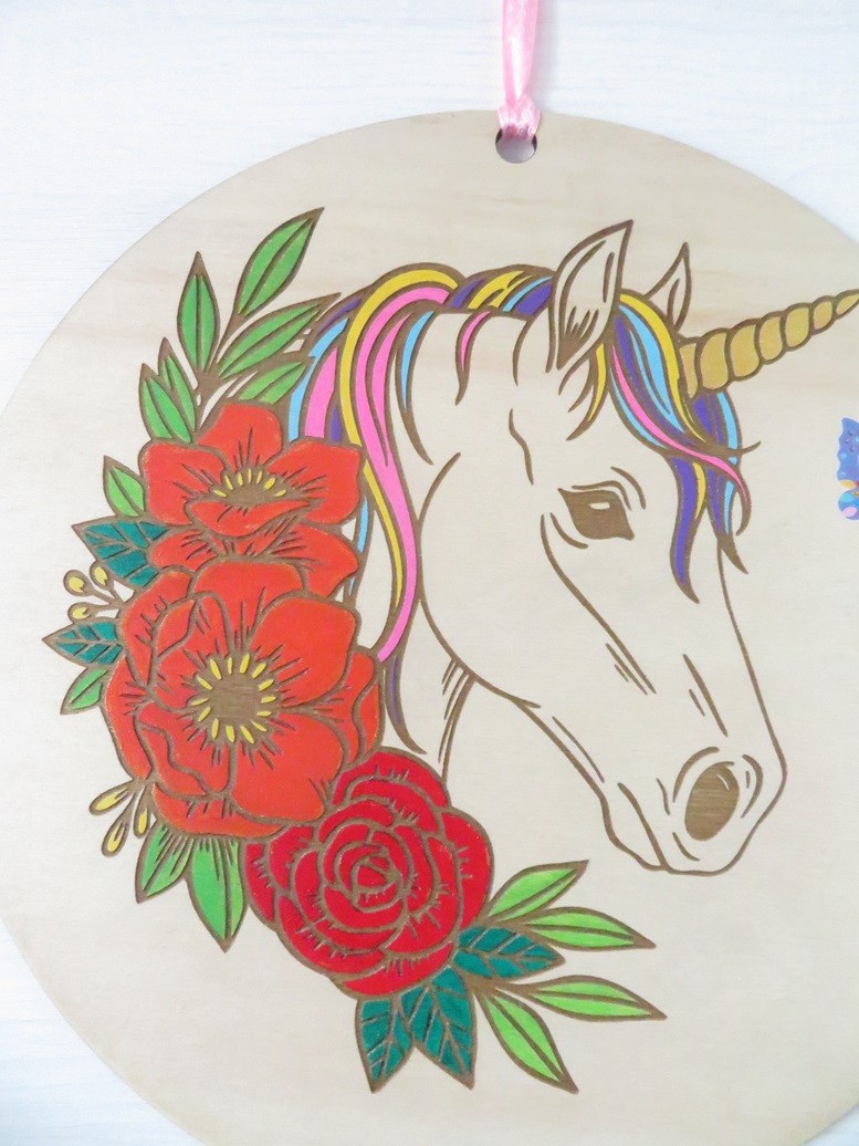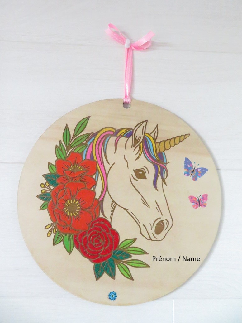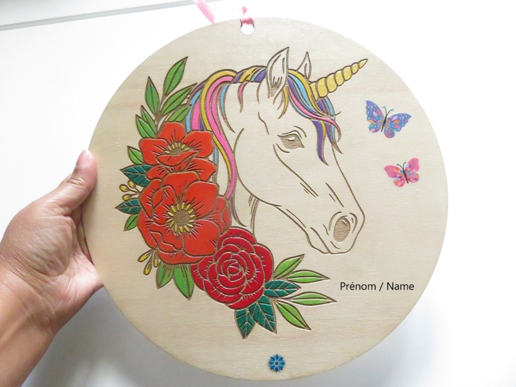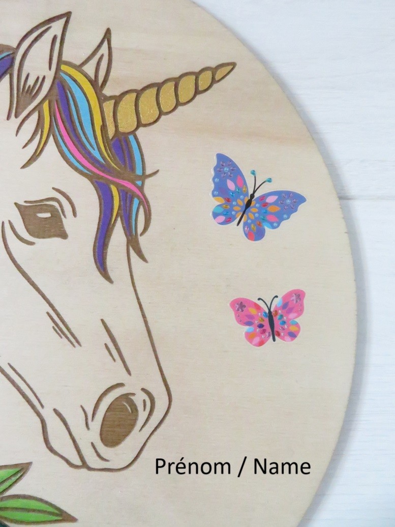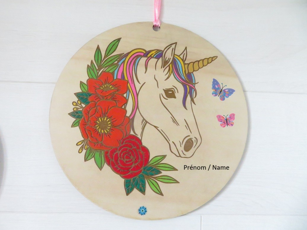 Rond en bois de tilleul avec une belle licorne fleuri peinte à la main et décorée de papillons colorés – vous pourrez suspendre cette déco au mur avec son ruban assorti