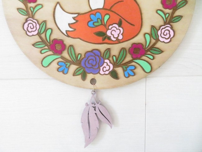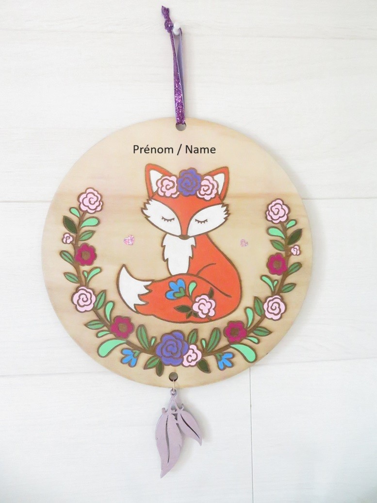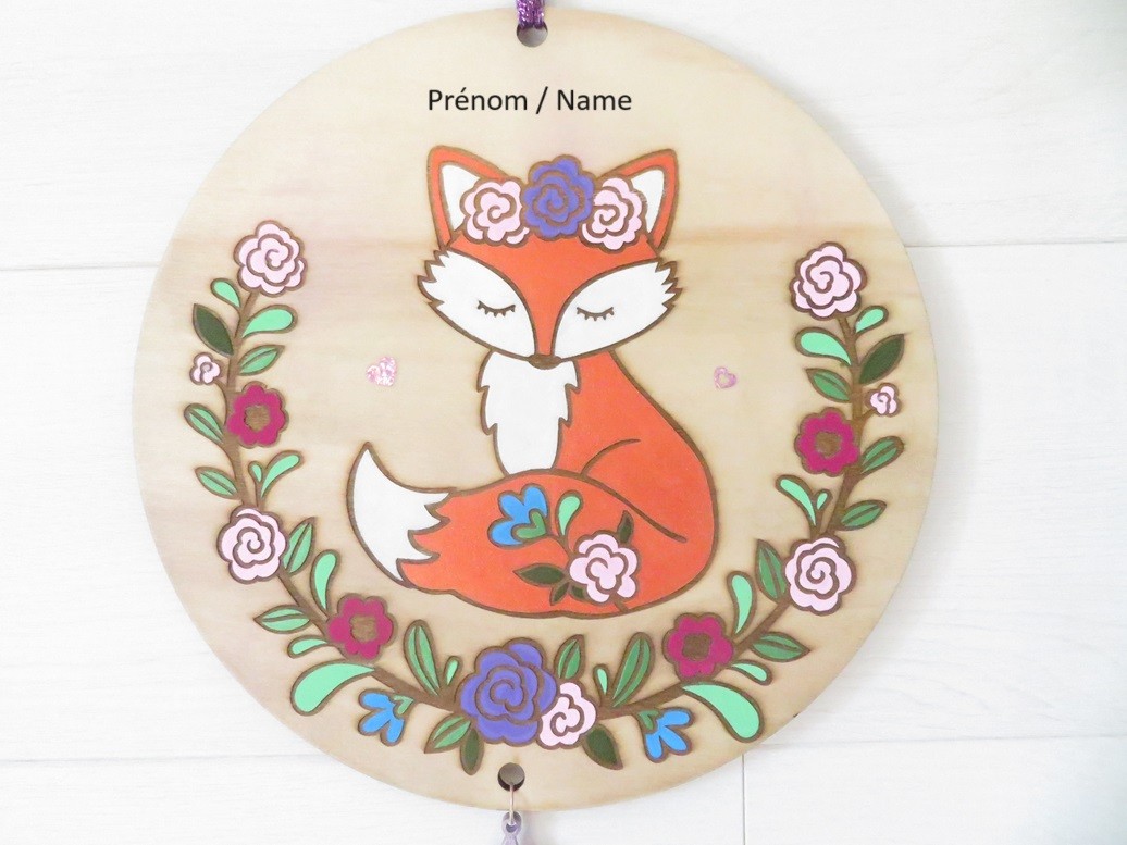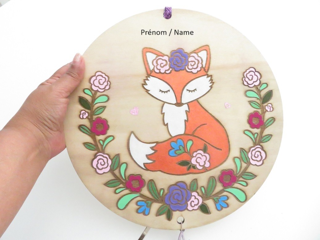 Rond en bois de tilleul avec une belle renarde fleuri peinte à la main – vous pourrez suspendre cette déco au mur avec son ruban assorti