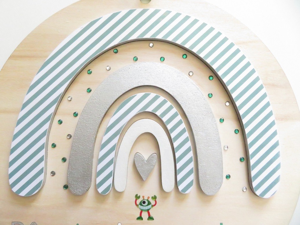 Rond en bois de tilleul avec un bel arc-en-ciel dans les tons vert – vous pourrez suspendre cette déco au mur avec son ruban assorti