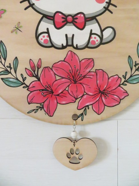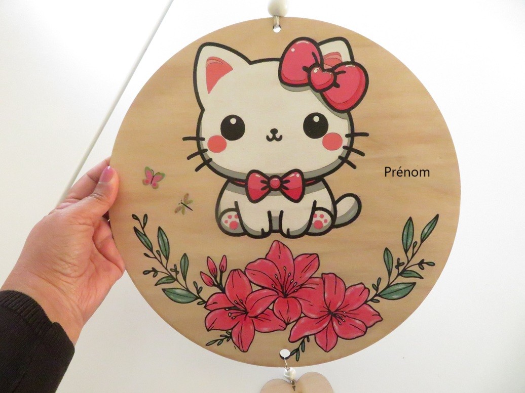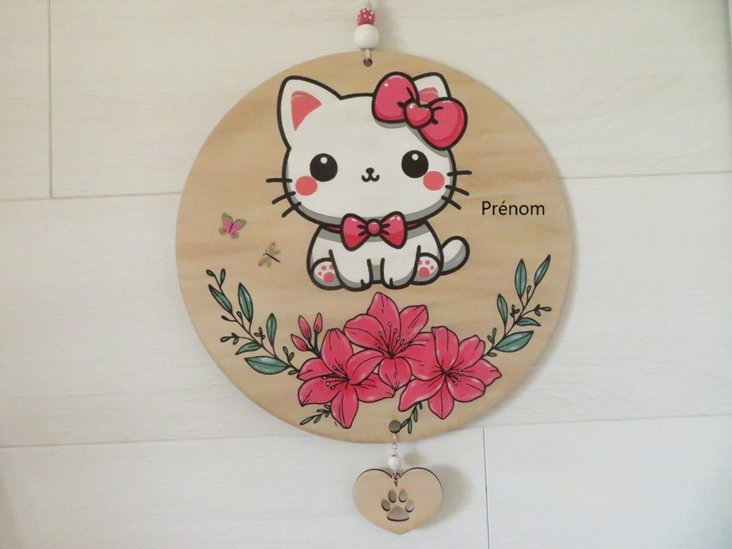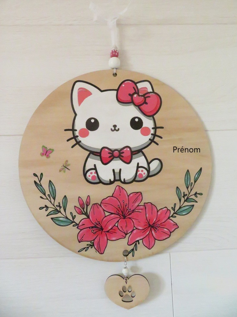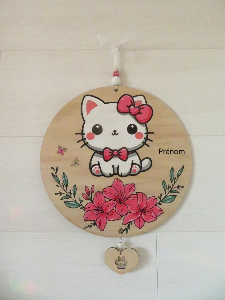 Rond en bois de tilleul avec une mignonne petite chatte fleuri peinte à la main – vous pourrez suspendre cette déco au mur avec son ruban assorti