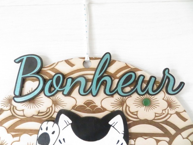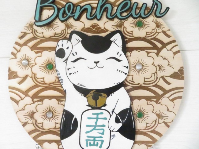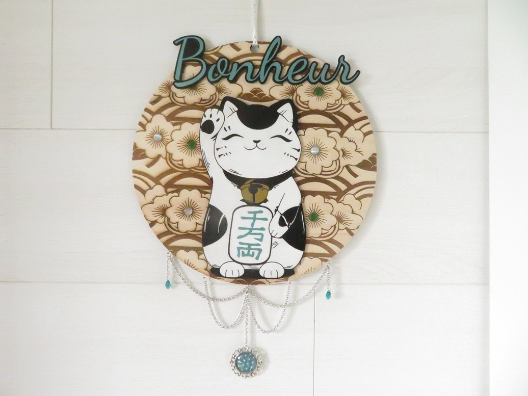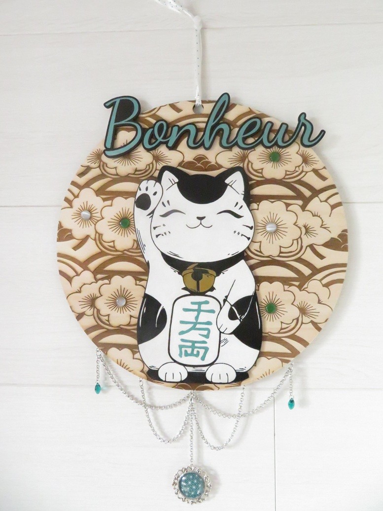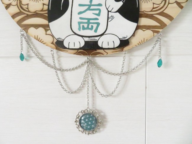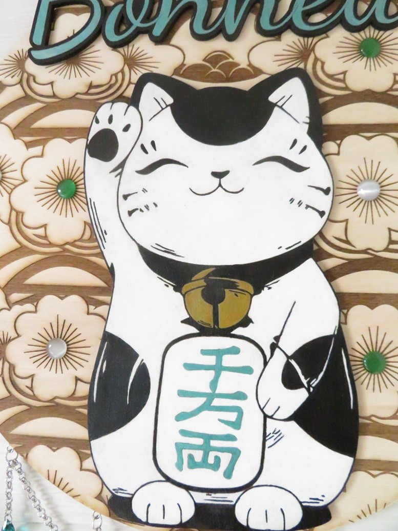 Rond en bois de tilleul décoré de fleurs du Japon avec un chat Maneki Neko et bonheur peints à la main, la supsension a été faite avec des chaines en métal argenté, des gouttes en verre vert émeraude et un cabochon motif japonais vert émeraude – vous pourrez suspendre cette déco au mur avec son ruban assorti
