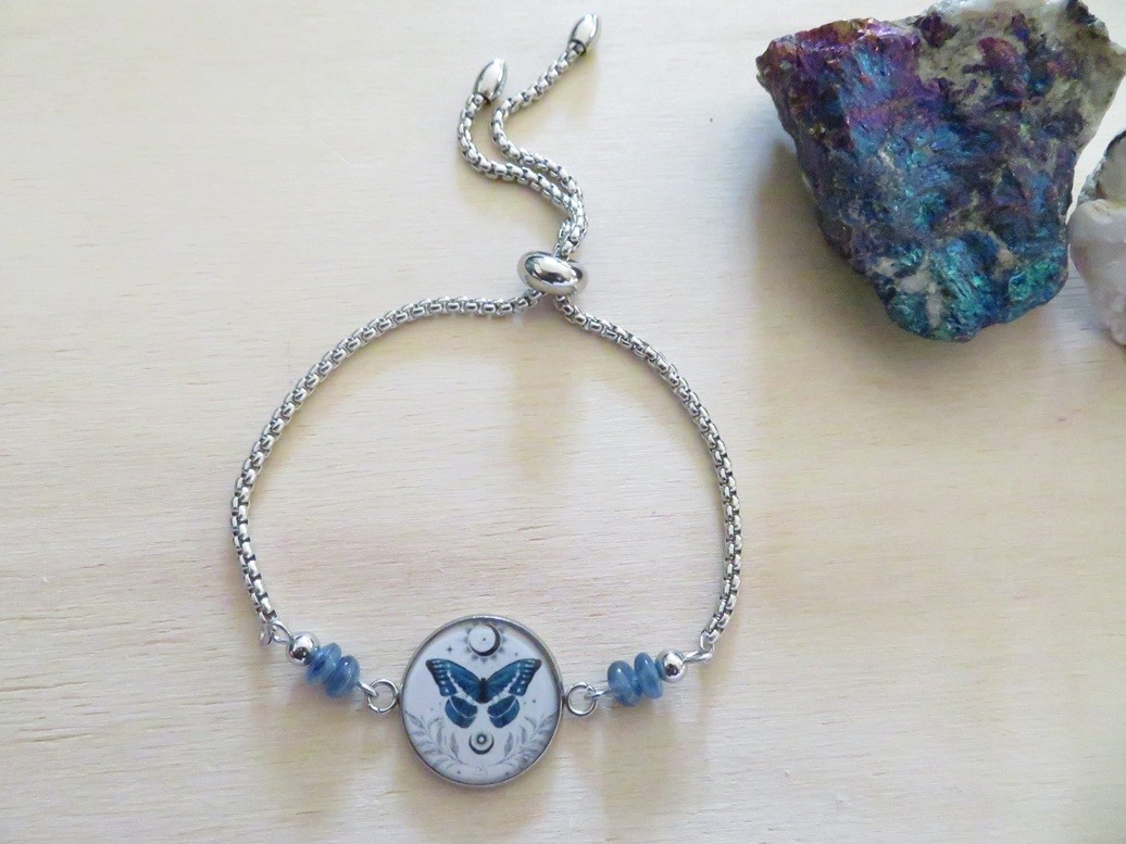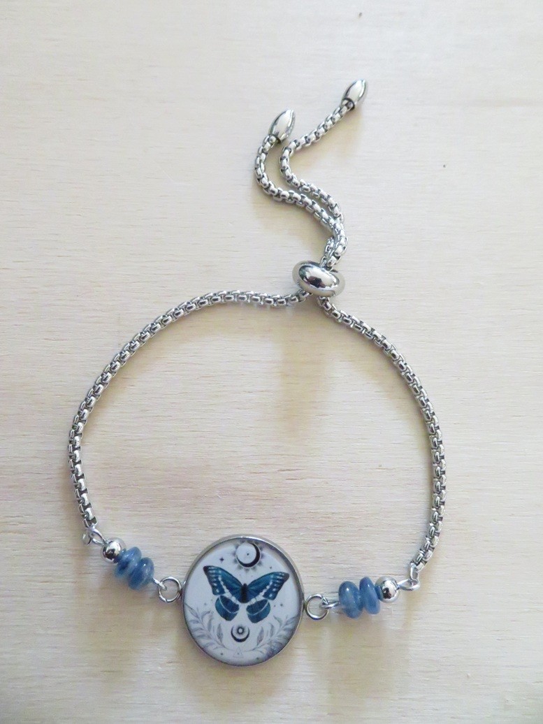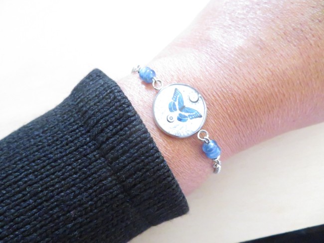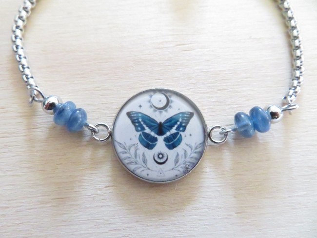 Cabochon en acier inoxydable et résine avec motif papillon bleu
