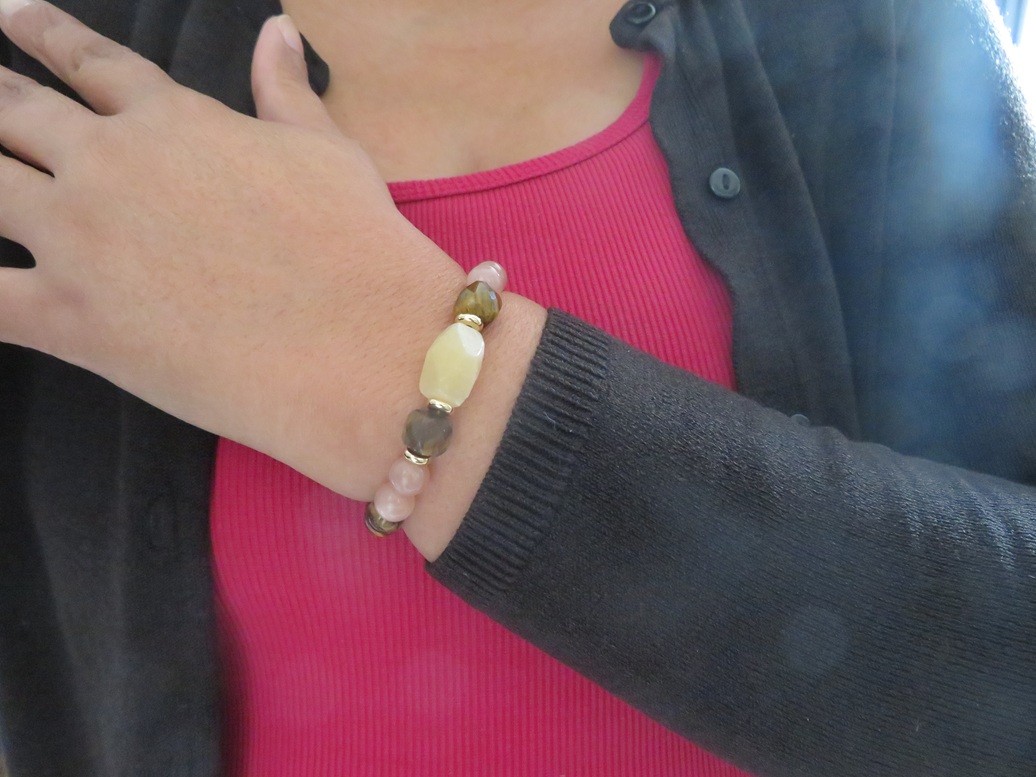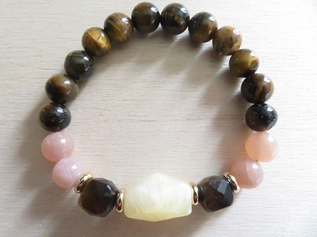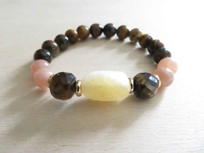 Bracelet en pierres naturelles Oeil de tigre (8 mm), Pierre de soleil (8 mm) et Calcite jaune (forme allongée à facettes) avec entretoise en acier inoxydable or monté sur un fil stretch