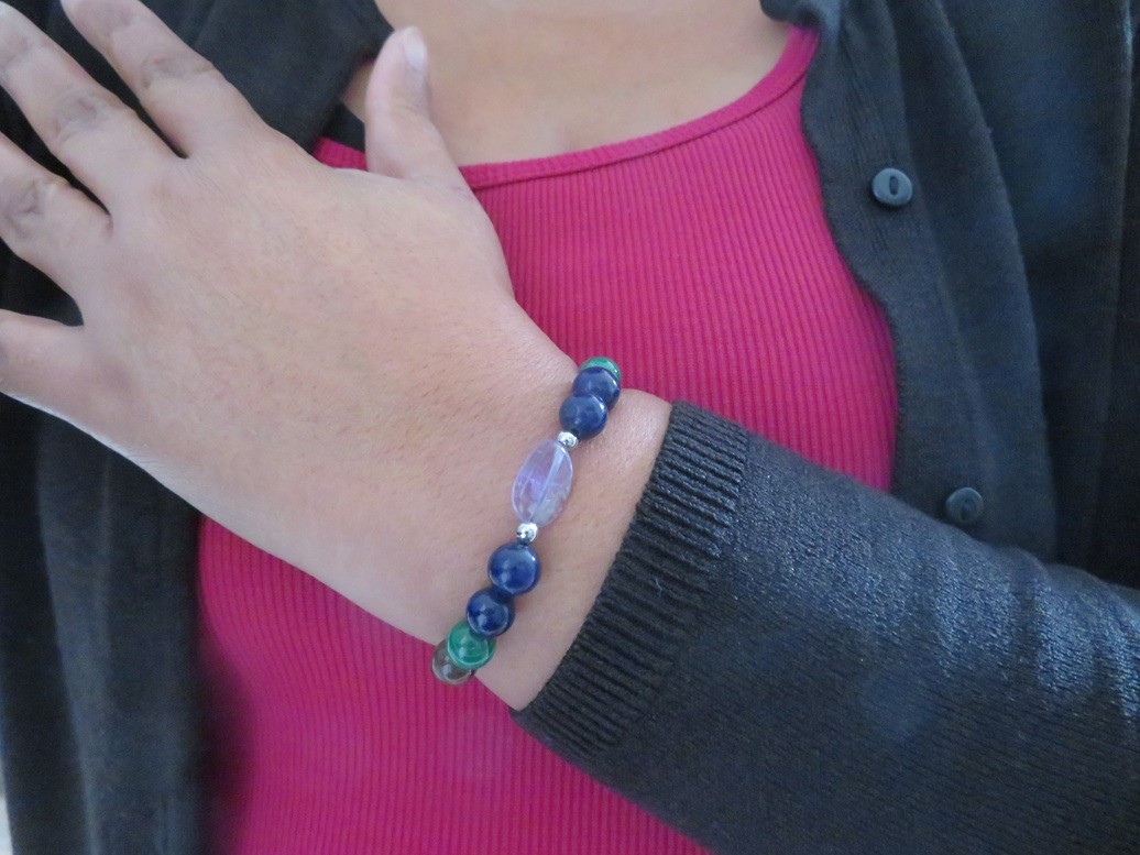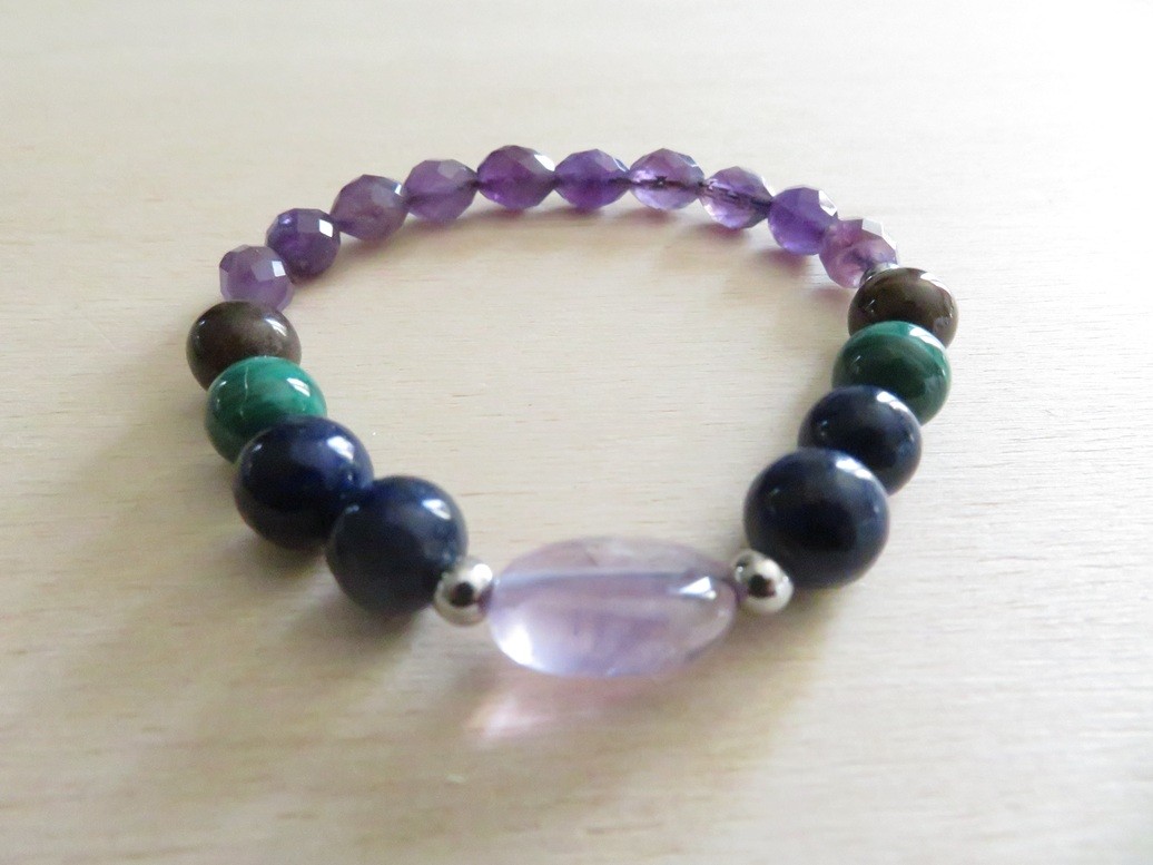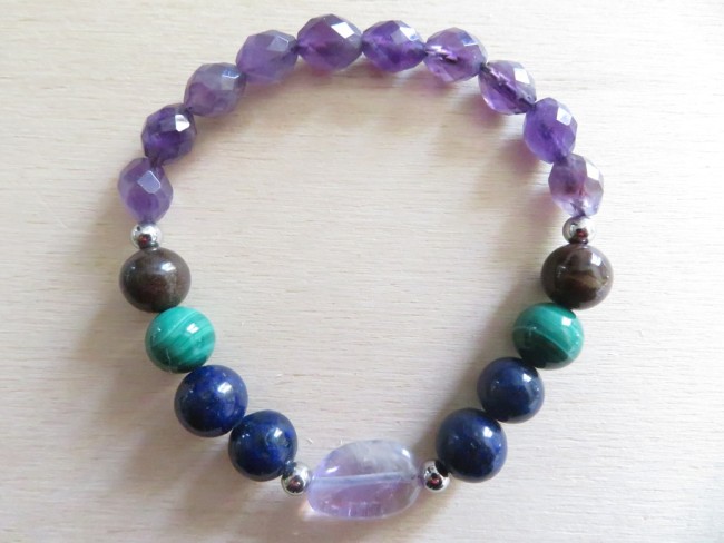 Bracelet en pierres naturelles Améthyste (forme olive à facettes), Améthyste lavande (forme baroque), Bois fossilisé (8 mm), Malachite (8 mm), Lapis lazuli (8 mm) avec boules en acier inoxydable argent monté sur un fil stretch