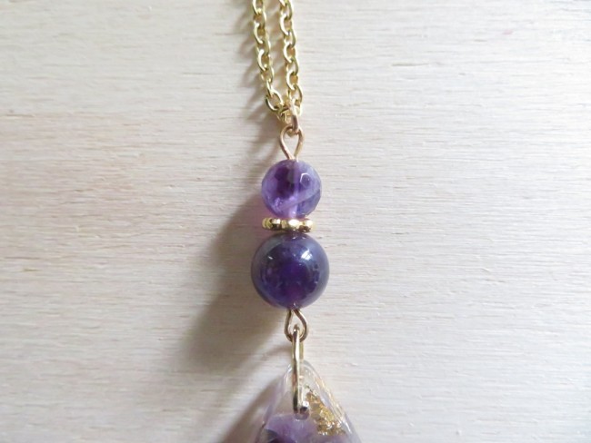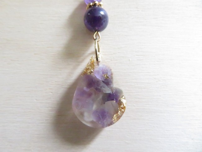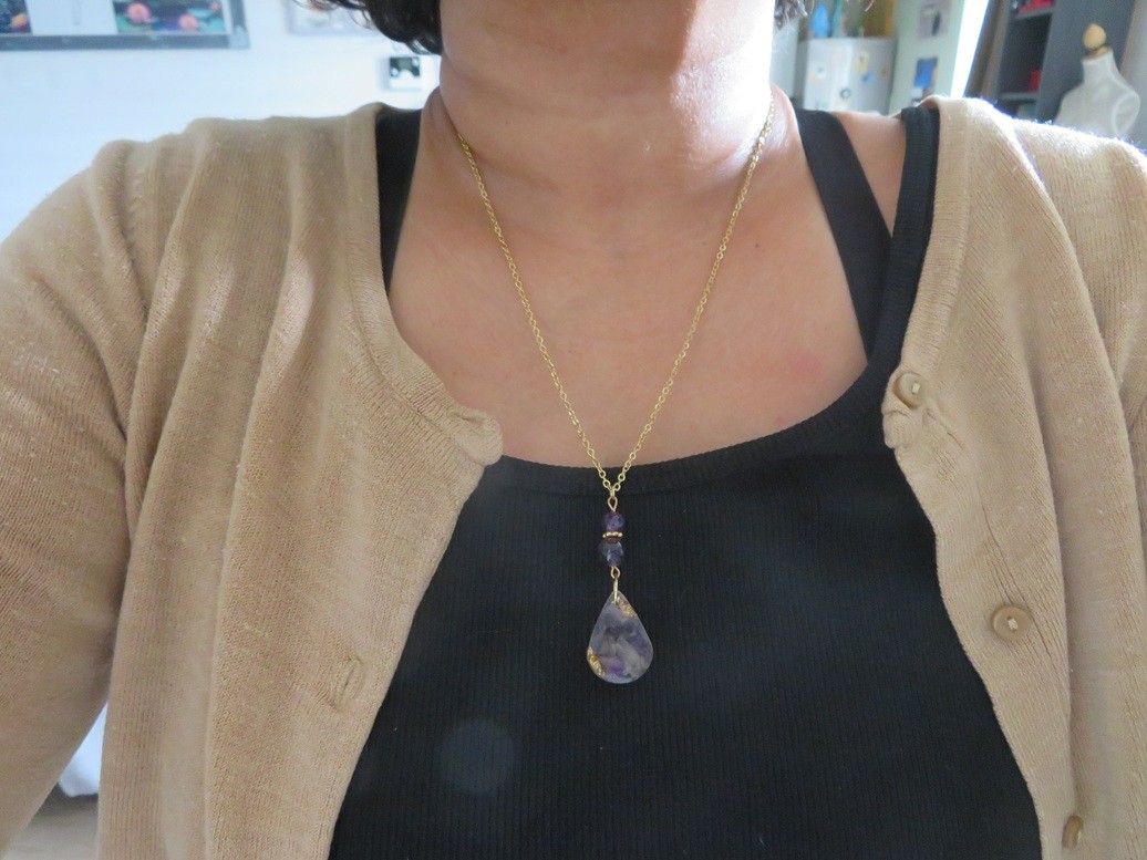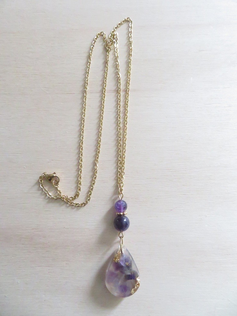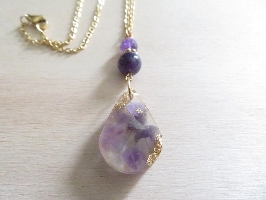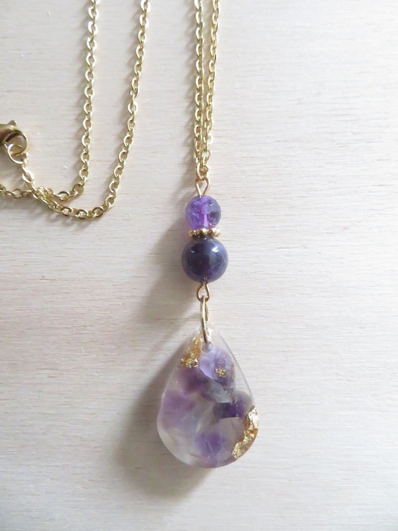 - Goutte faite en résine incrusté de pierres naturelles Améthyste et flocons or - dimension : 2.5 x 1.8 cm