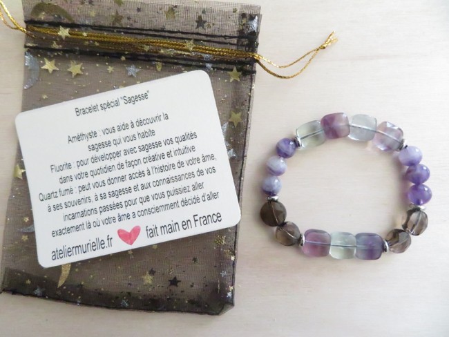 Bracelet en pierres naturelles Améthyste (8 mm), Fluorite (carré), Quartz fumé (rond plat à facettes) avec entretoises en acier inoxydable argent monté sur un fil stretch