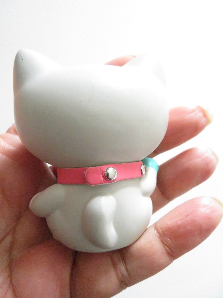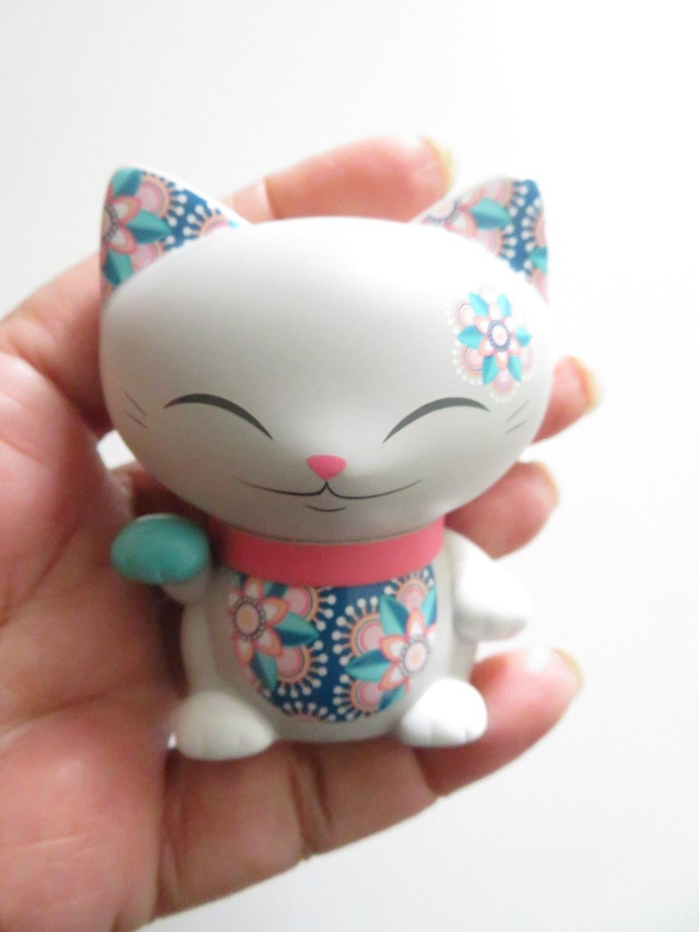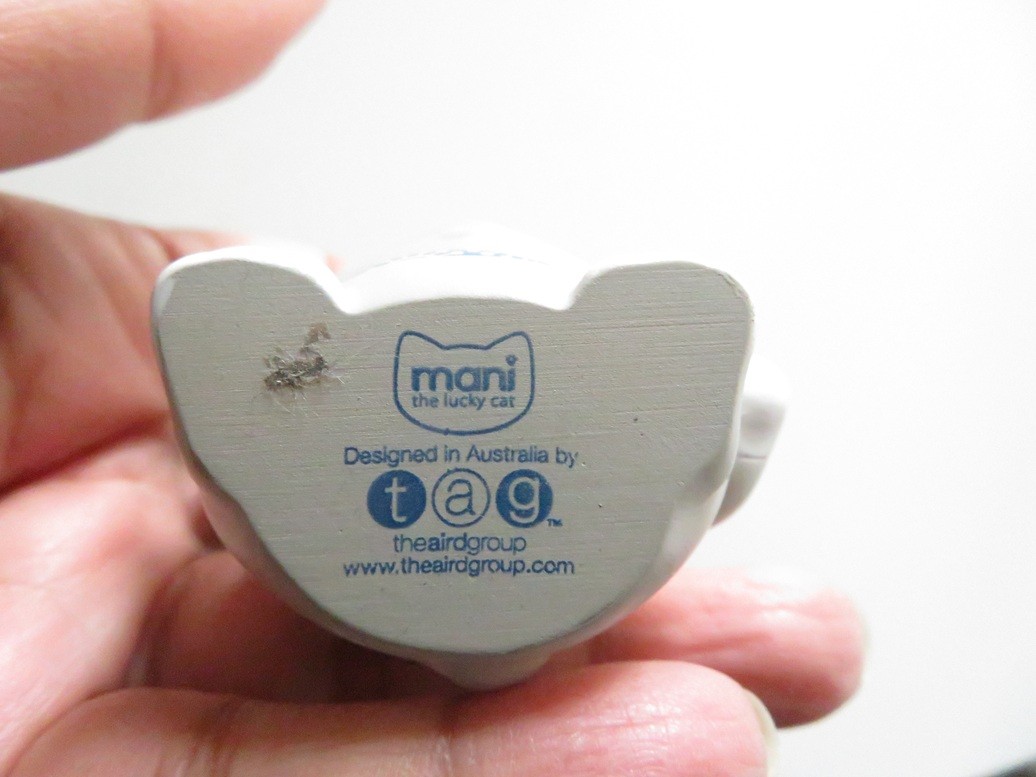 Très joli chat "Mani the lucky cat" de couleur gris clair et coloré - chat de 9 cm - en super état, vendue sans boite