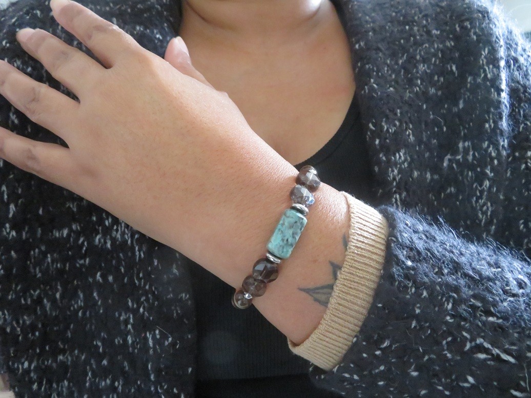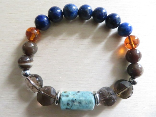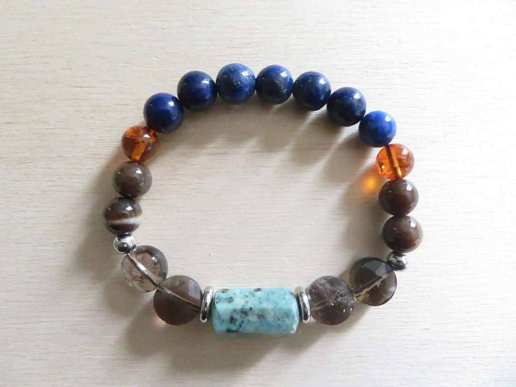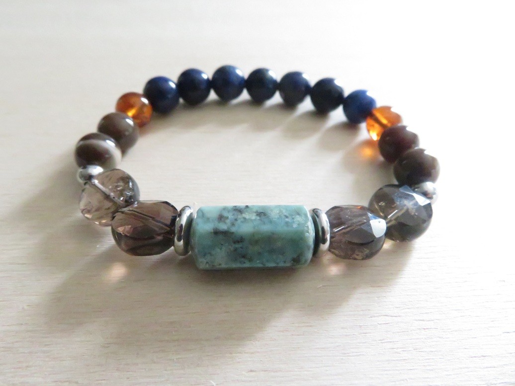 Bracelet en pierres naturelles Lapis lazuli (8 mm), Ambre de la Baltique (8 mm), Quartz fumé (rond plat à facettes), Bois fossilisé (8 mm), Turquoise (forme allongé à facettes) avec entretoises et boules en acier inoxydable argent monté sur un fil stretch