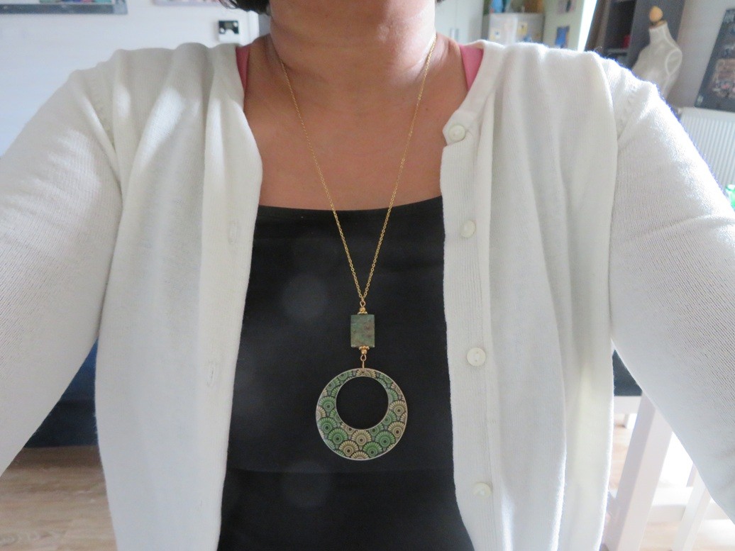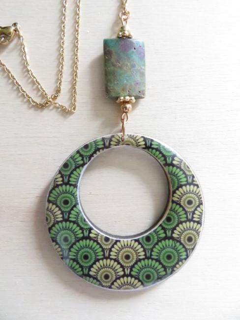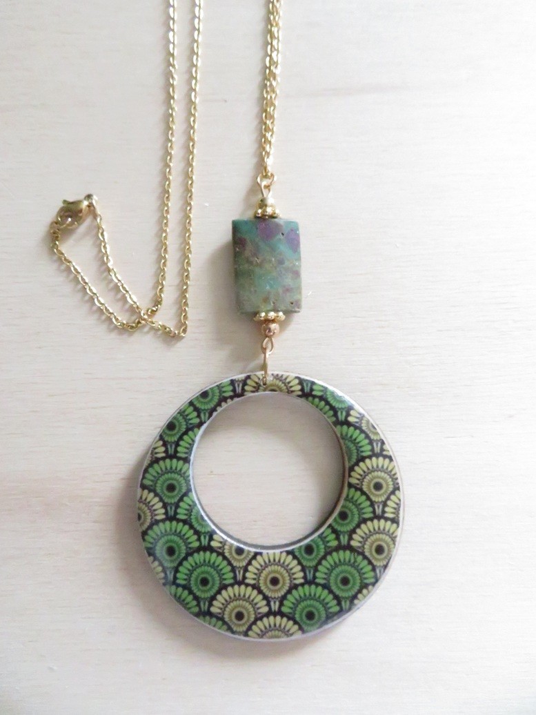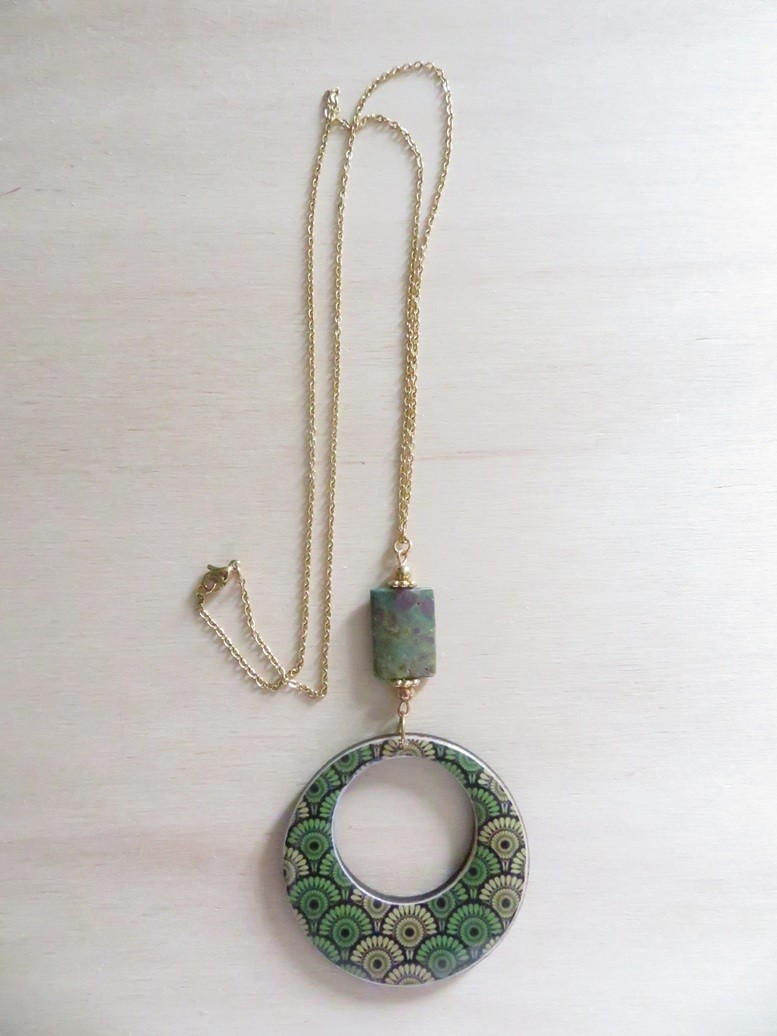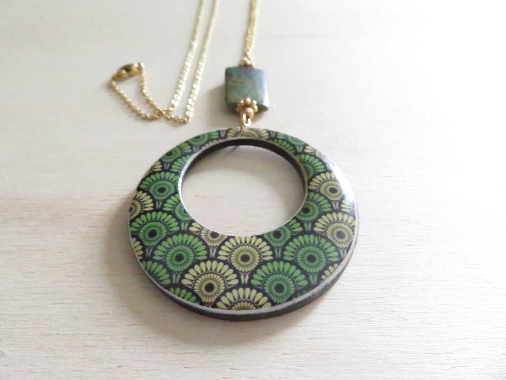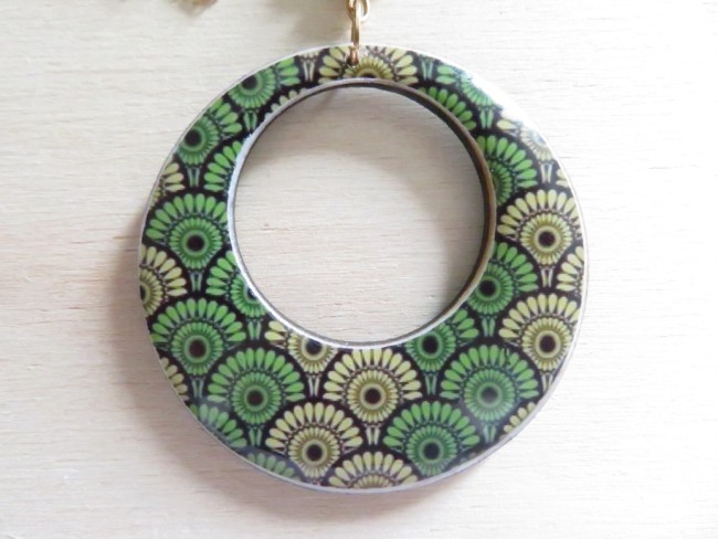 - Rond ajouré fait en bois et en résine avec un beau motif africain wax jaune et vert - dimension : 5 cm