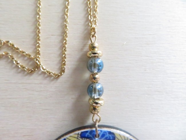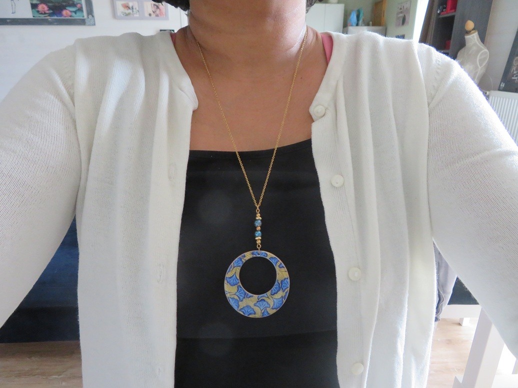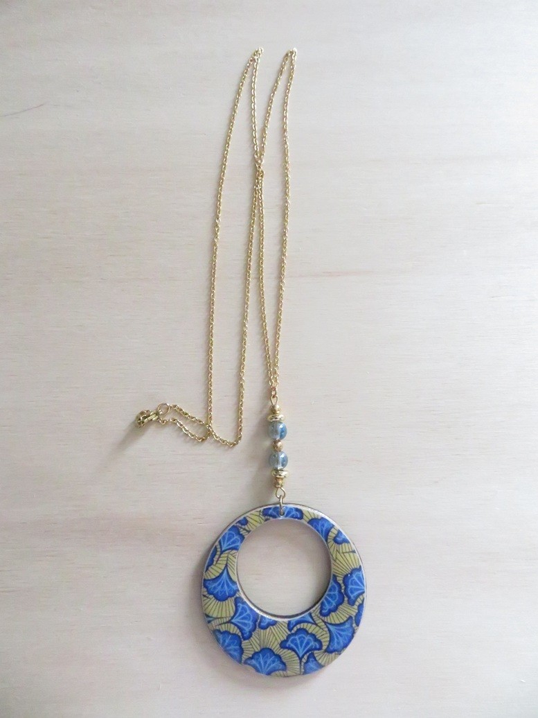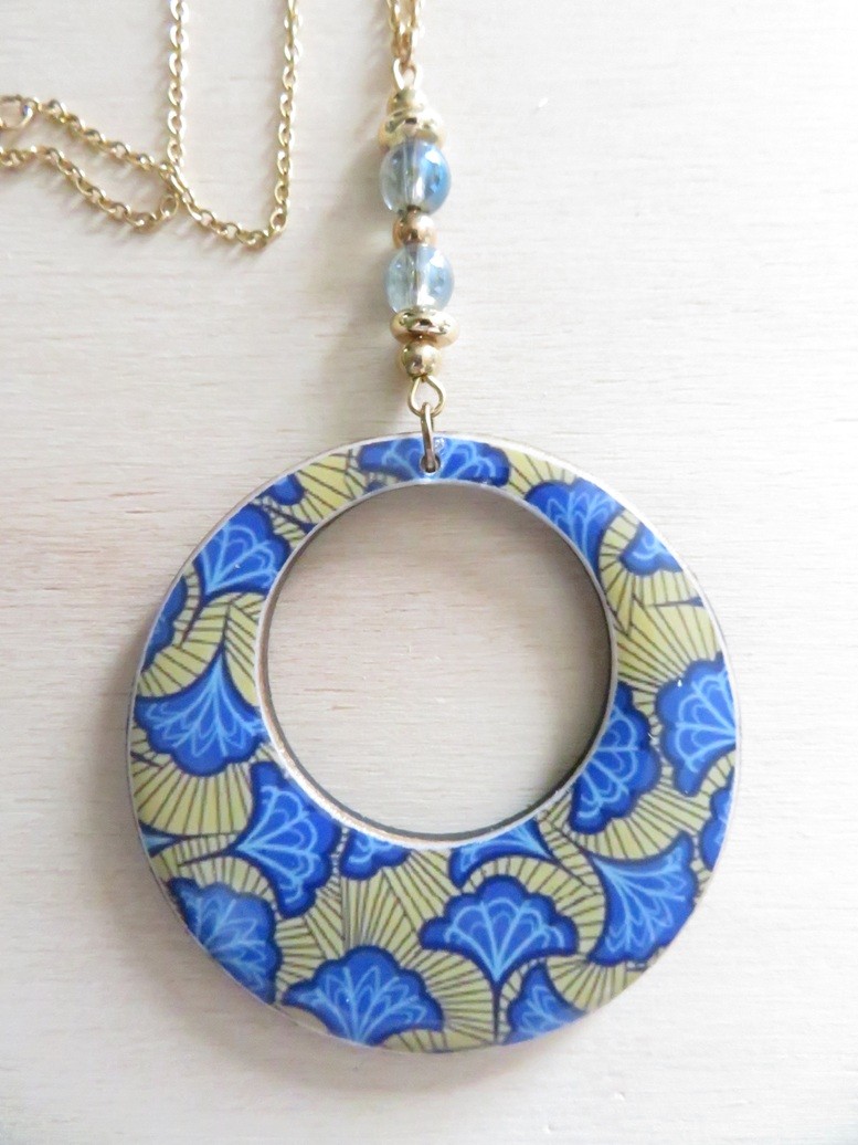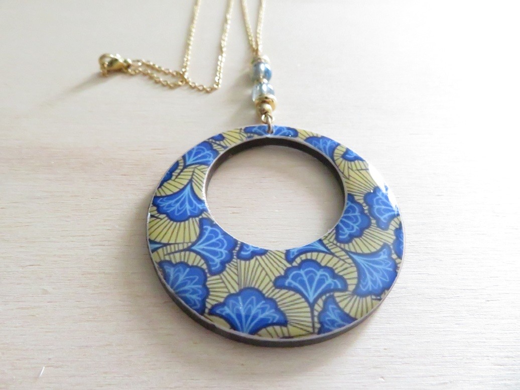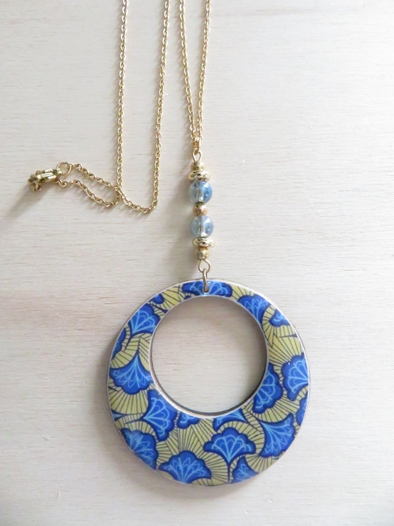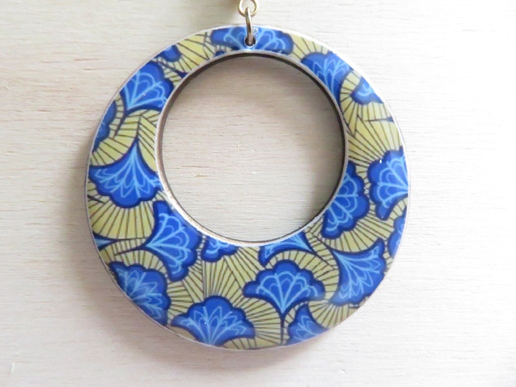 - Rond ajouré fait en bois et en résine avec un beau motif africain wax jaune et bleu - dimension : 5 cm