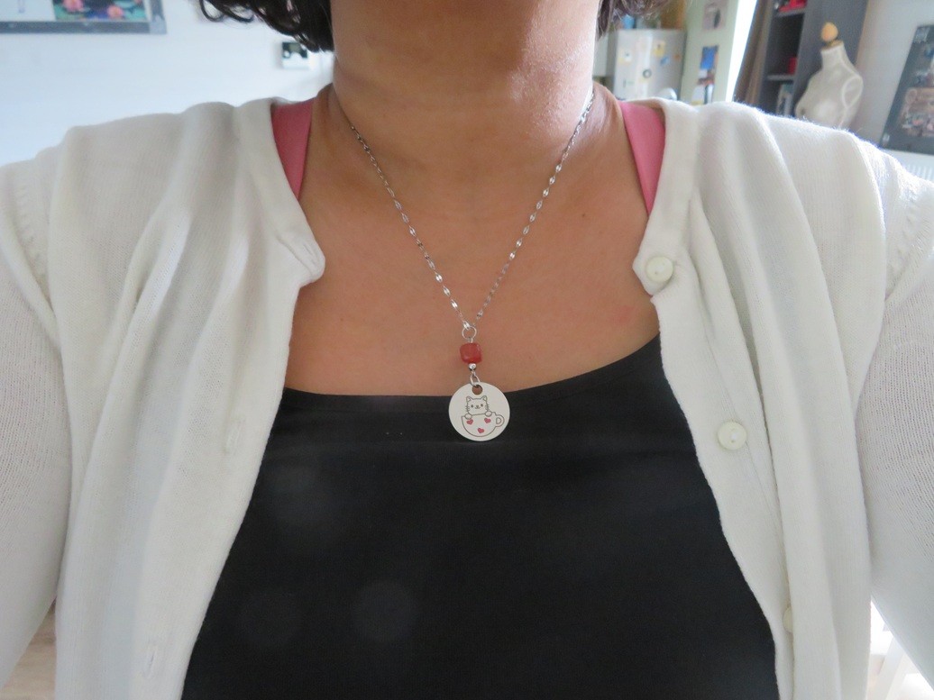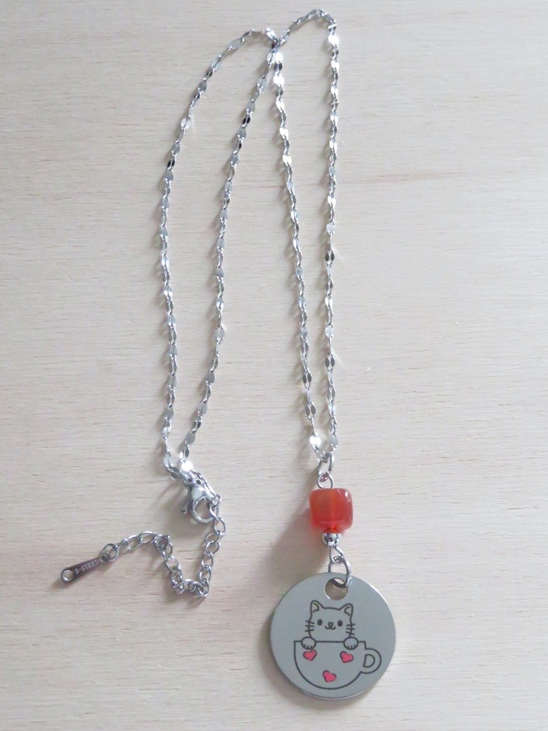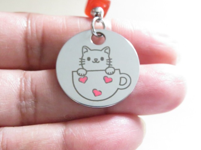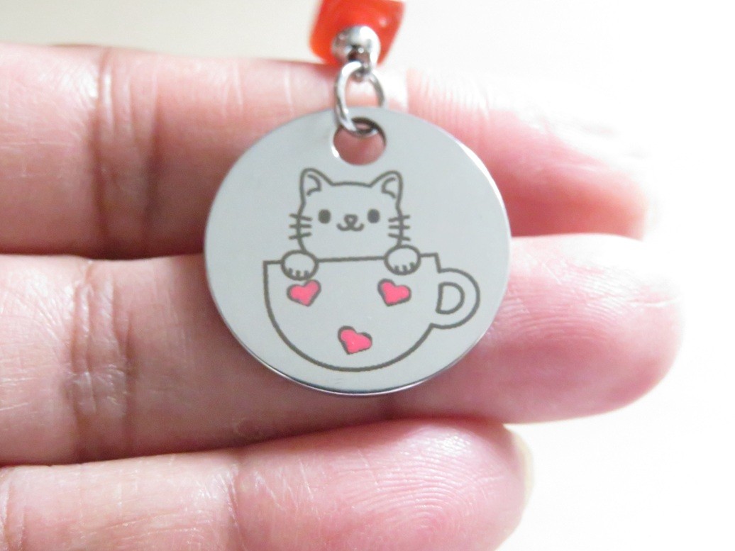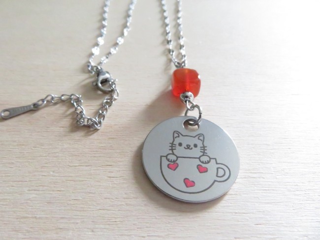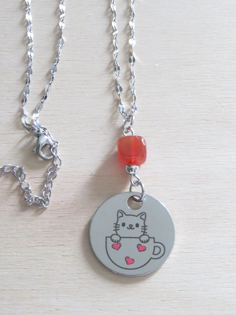 - Médaillon en acier inoxydable argent avec gravure chat dans une tasse (23 mm)