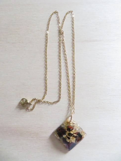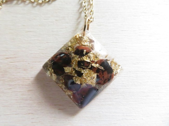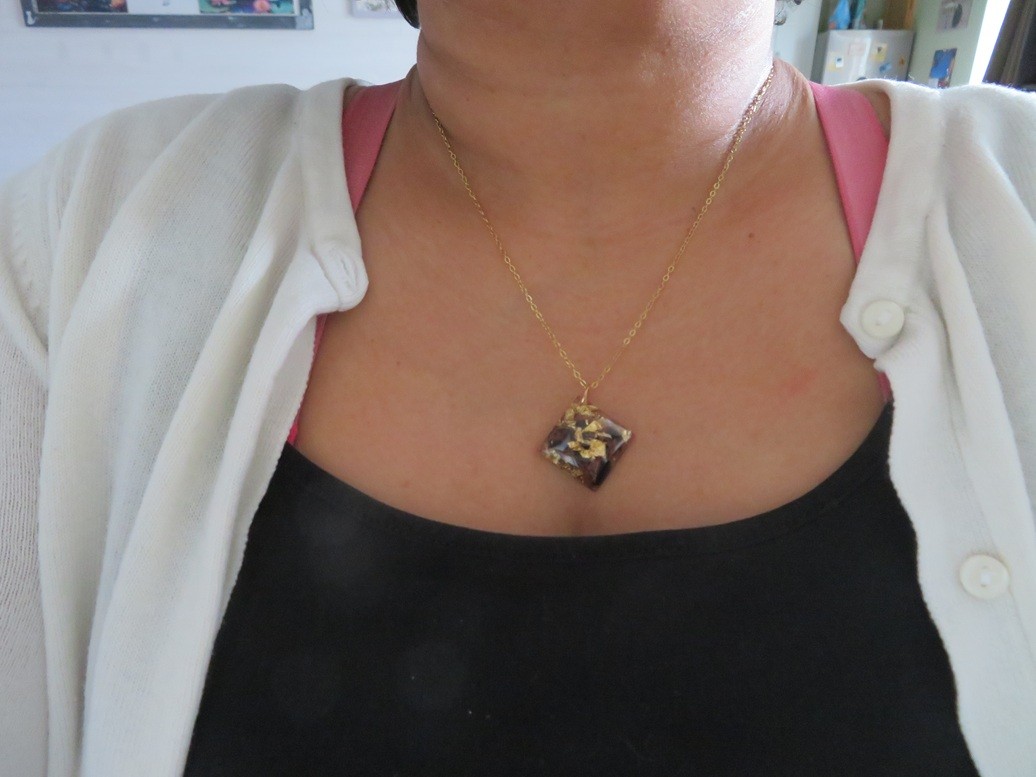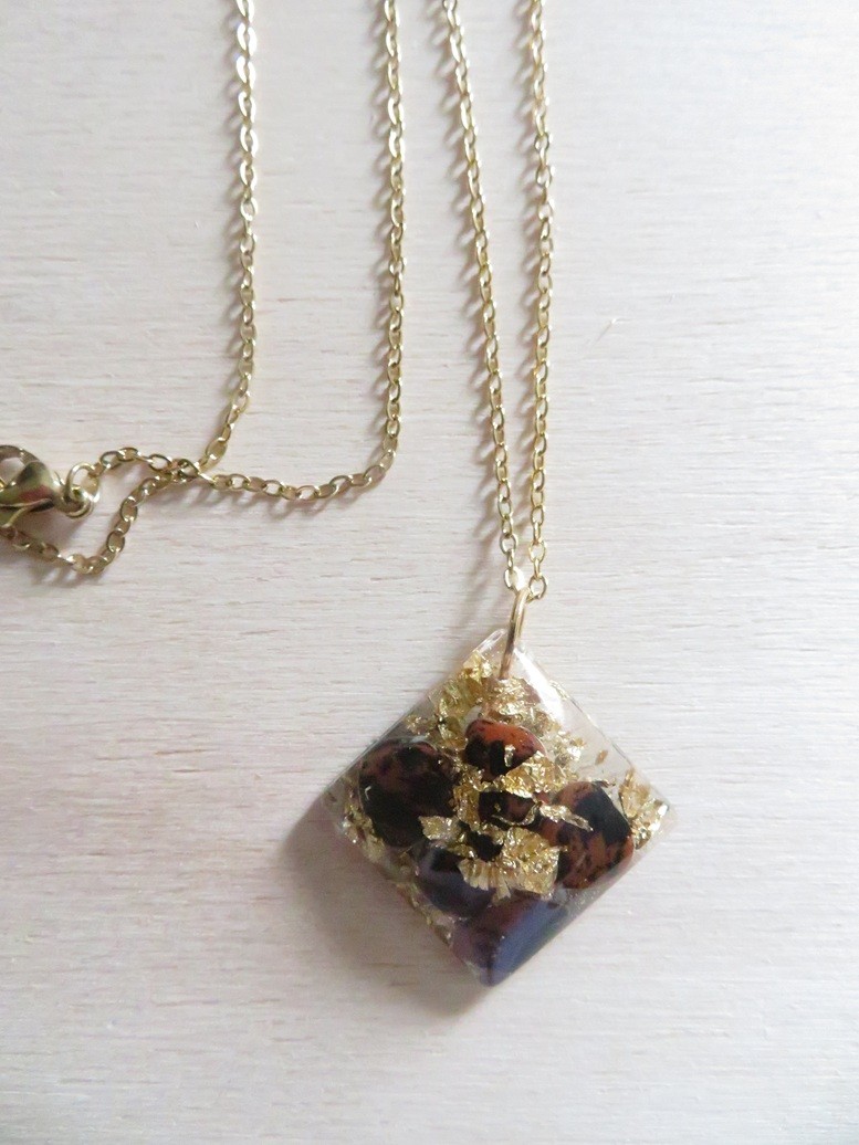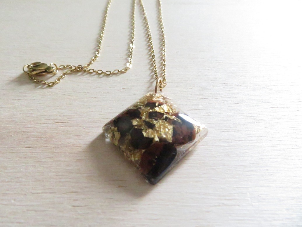 - Losange fait en résine incrusté de pierres naturelles Obsidienne acajou et flocons or - dimension : 2.7 cm
