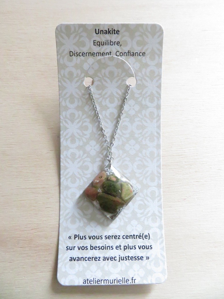 - Losange fait en résine incrusté de pierres naturelles Unakite et flocons argent - dimension : 2.7 cm
