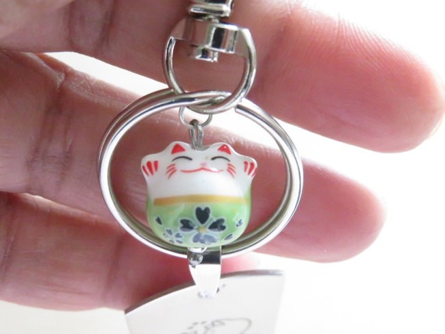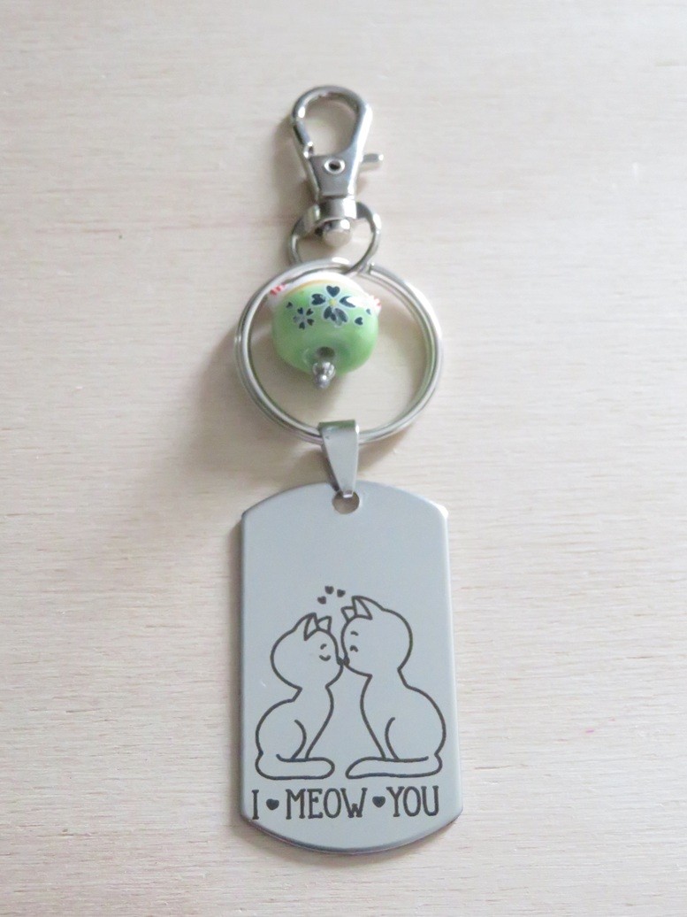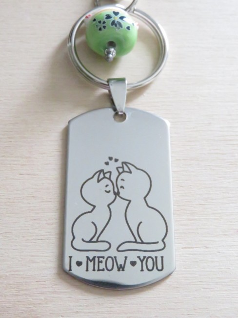 Très beau porte-clés ou bijou de sac gravure "couple de chat" sur une base en acier inoxydable. Le chat vert est en porcelaine et le mousqueton en métal argenté