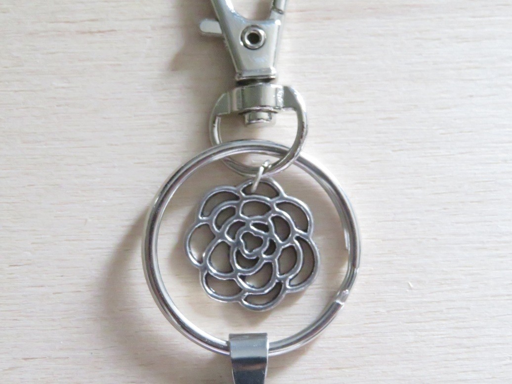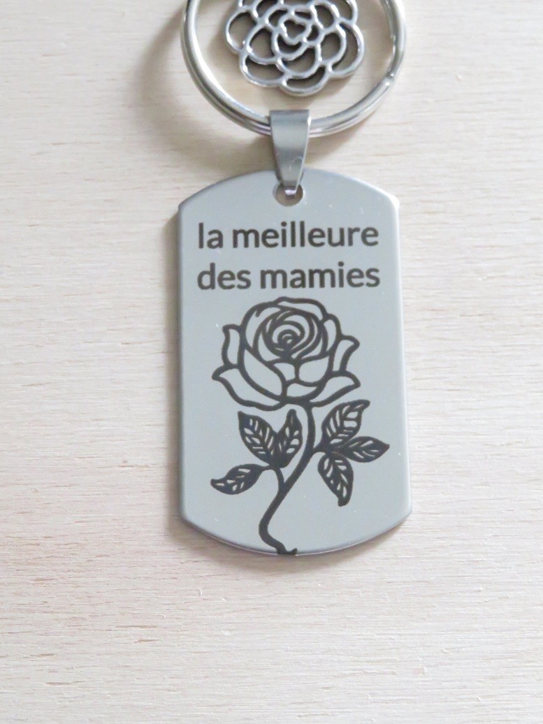 Très beau porte-clés ou bijou de sac gravure "Fleur et la meilleure des mamies" sur une base en acier inoxydable. La rose et le mousqueton sont en métal argenté