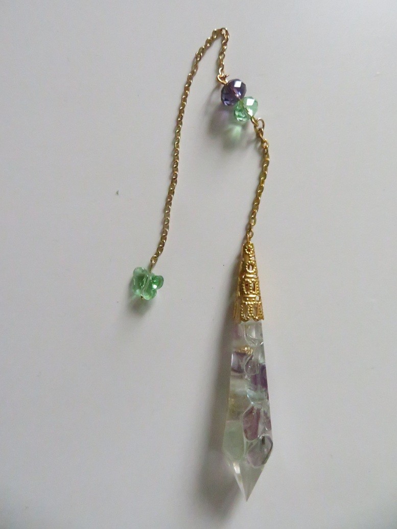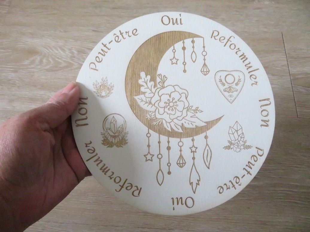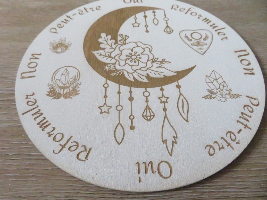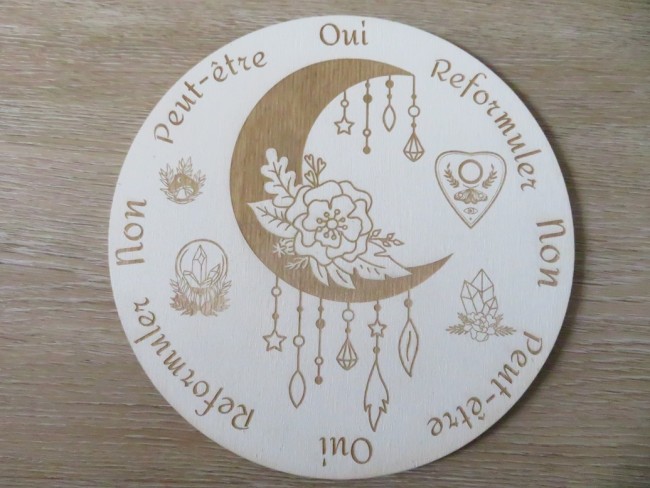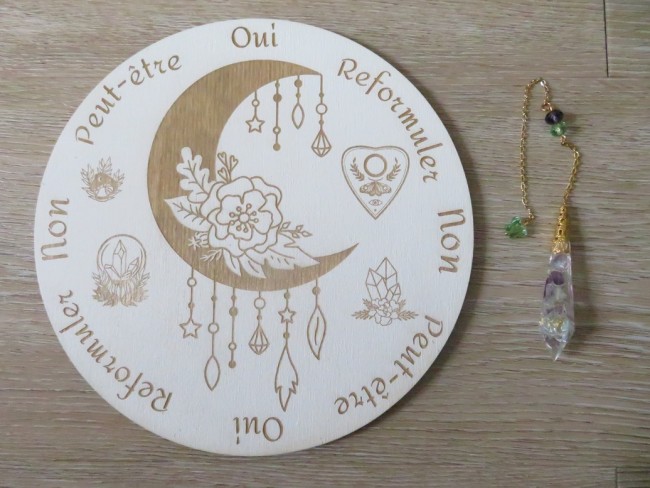 Plateau de divination en bois de tilleul peint en blanc de 5 mm d'épaisseur avec une jolie gravure lune mystique et son pendule fait en résine incrusté de pierres naturelles Fluorite