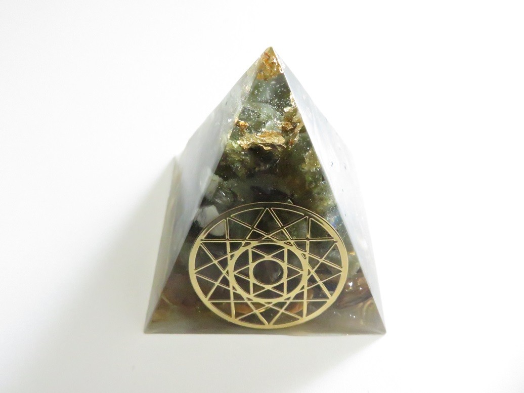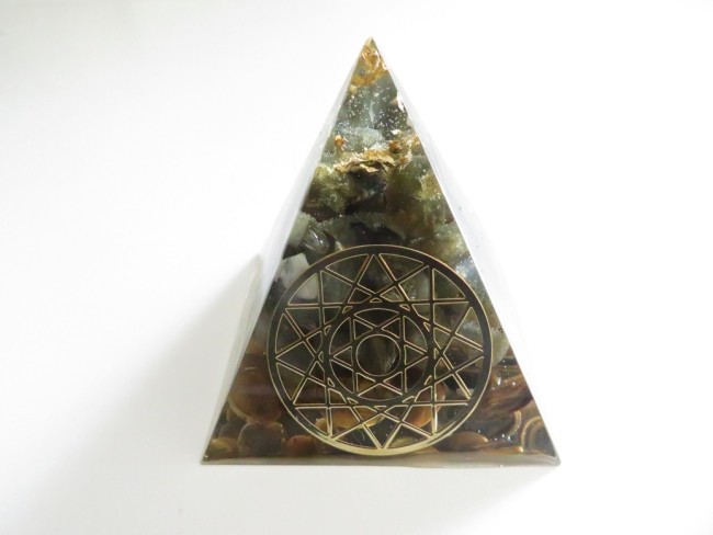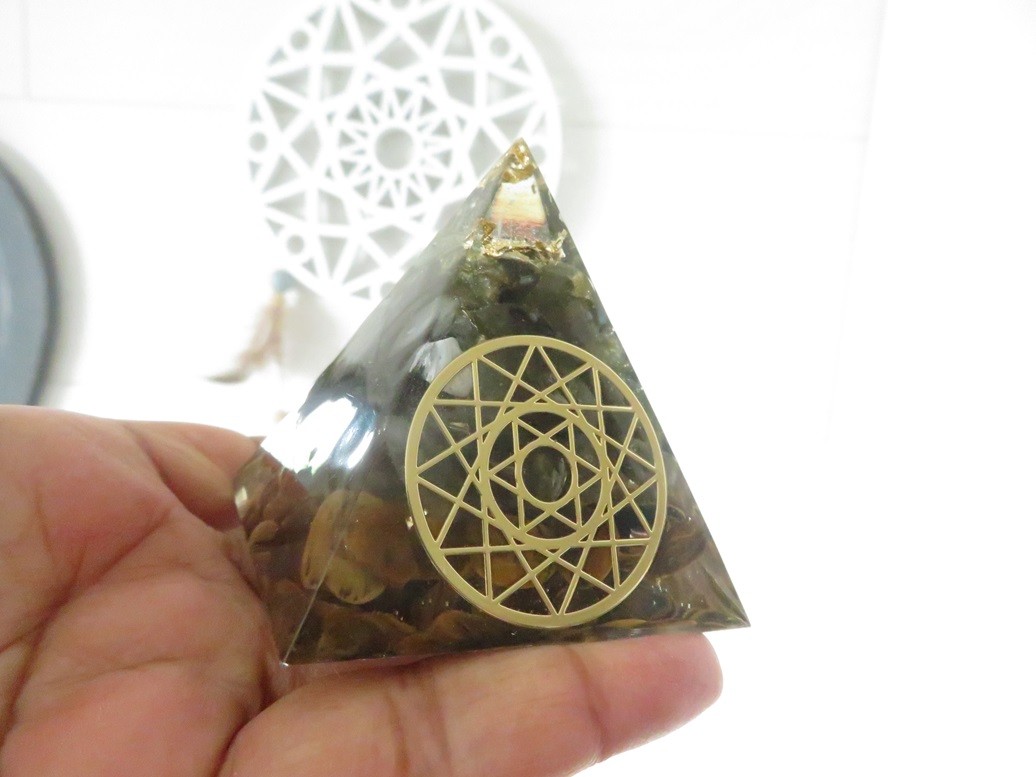 Très belle pyramide 100% fait main en résine incrusté de pierres naturelles Labradorite et Oeil de tigre avec Symbole sacré en cuivre or - Dimension de la pyramide : 6.5 x 6 cm