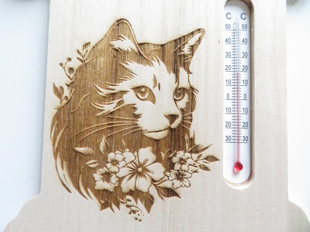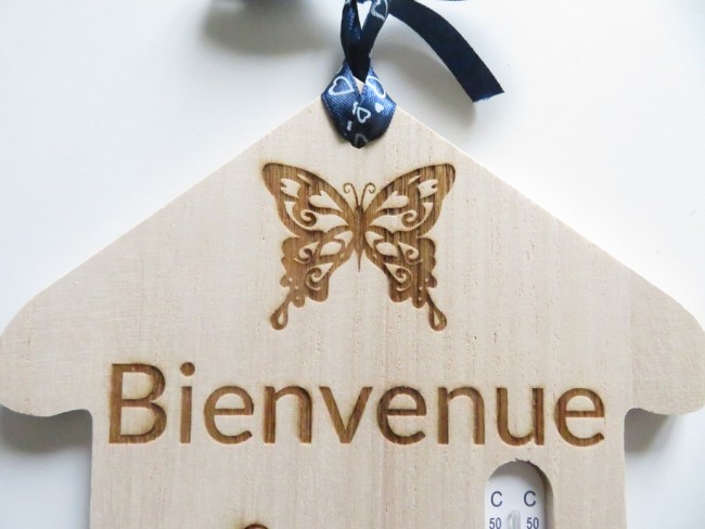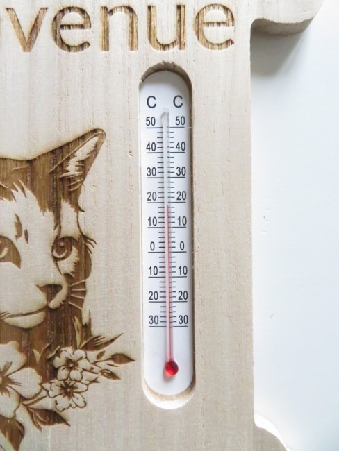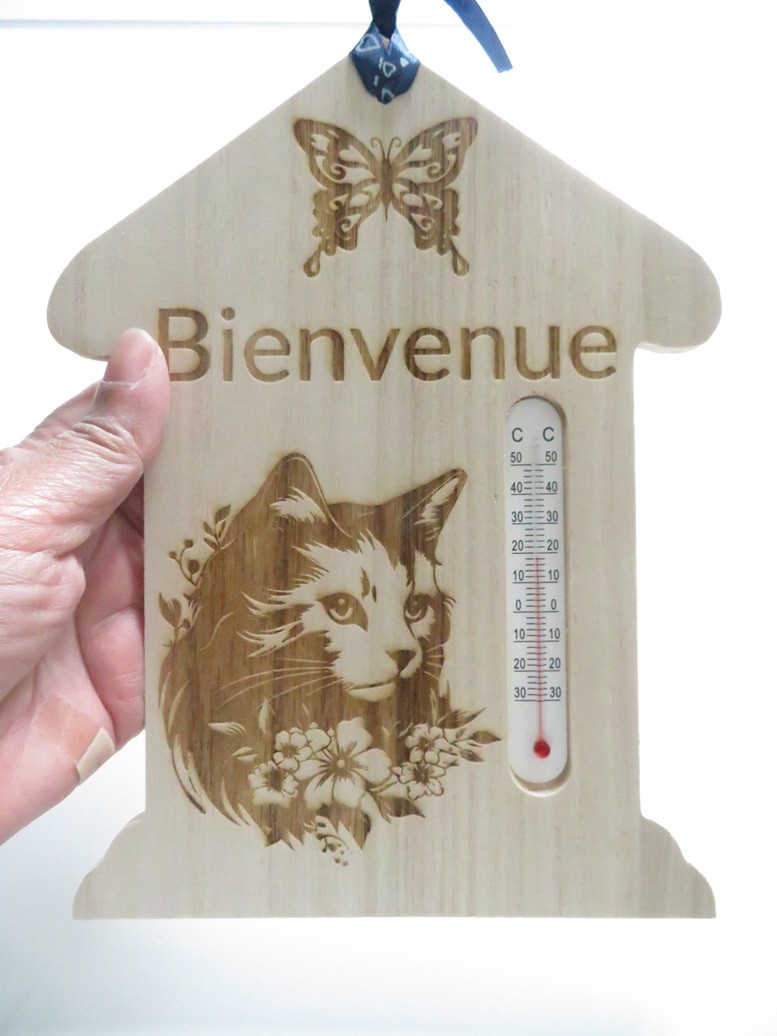 Thermomètre en bois très léger en forme de maison avec de belles gravures : chat fleuri, papillon et Bienvenue - vous pourrez suspendre cette maison avec son ruban assorti