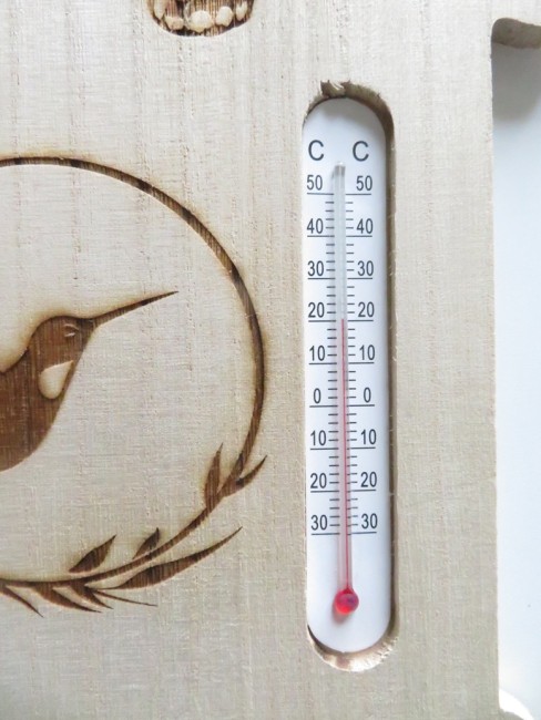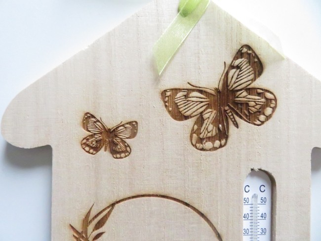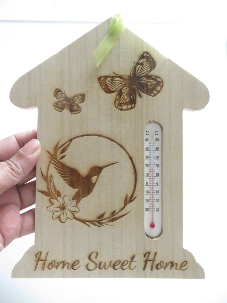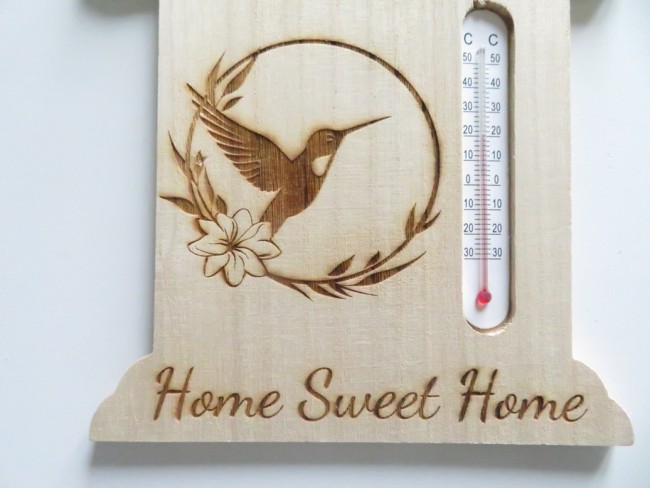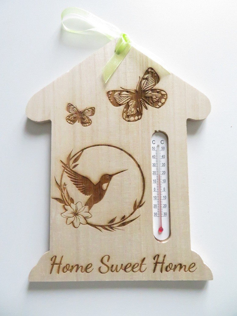 Thermomètre en bois très léger en forme de maison avec de belles gravures : colibri, papillons, Home sweet Home - vous pourrez suspendre cette maison avec son ruban assorti