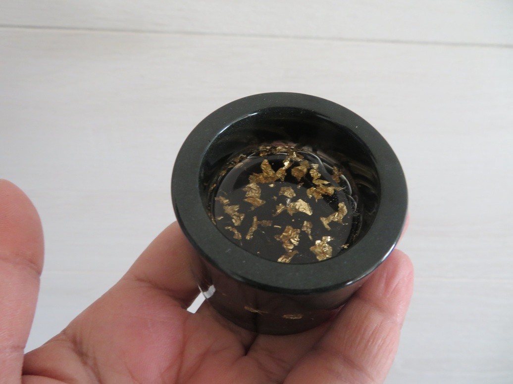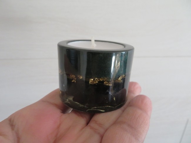 Petit bougeoir rond 100% fait main en résine vert sapin incrusté de pierres naturelles Obsidienne et flocons or - vous pourrez y mettre une bougie type chauffe plat par exemple - Dimension du bougeoir : 5 x 3.7 cm