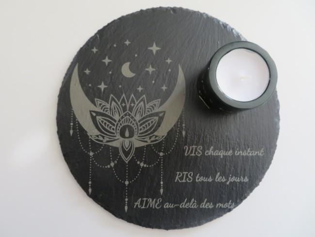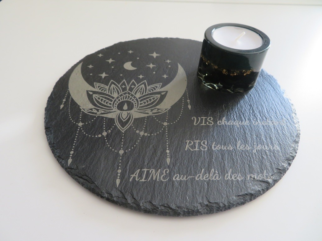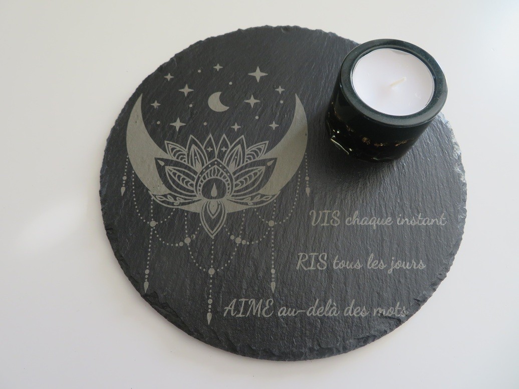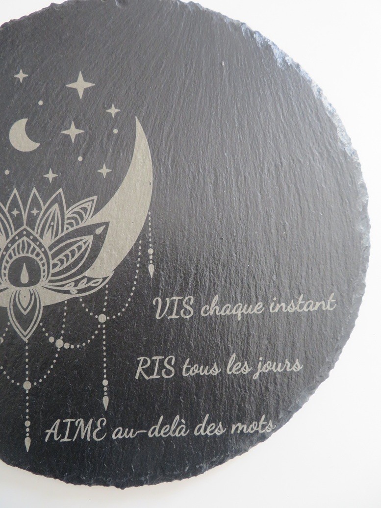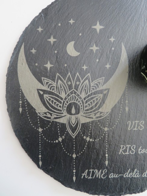 Support en ardoise rond de 20 cm avec de jolies gravures : lune style attrape-rêve et citation "Vis chaque instant, Ris tous les jours, Aime au-delà des mots"