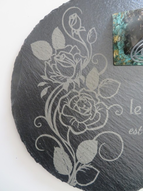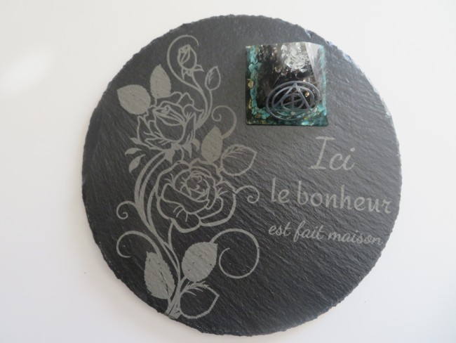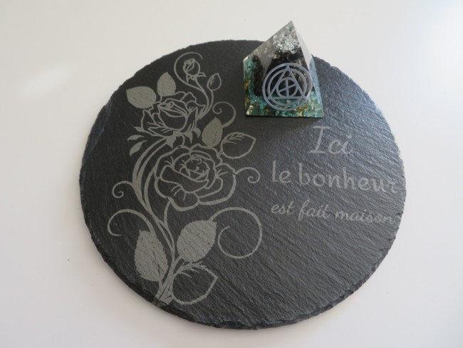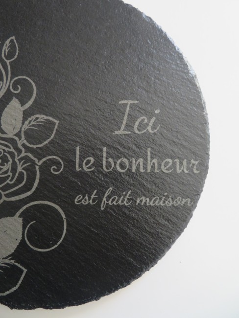 Support en ardoise rond de 20 cm avec de jolies gravures : roses et citation "Ici le bonheur est fait maison"
