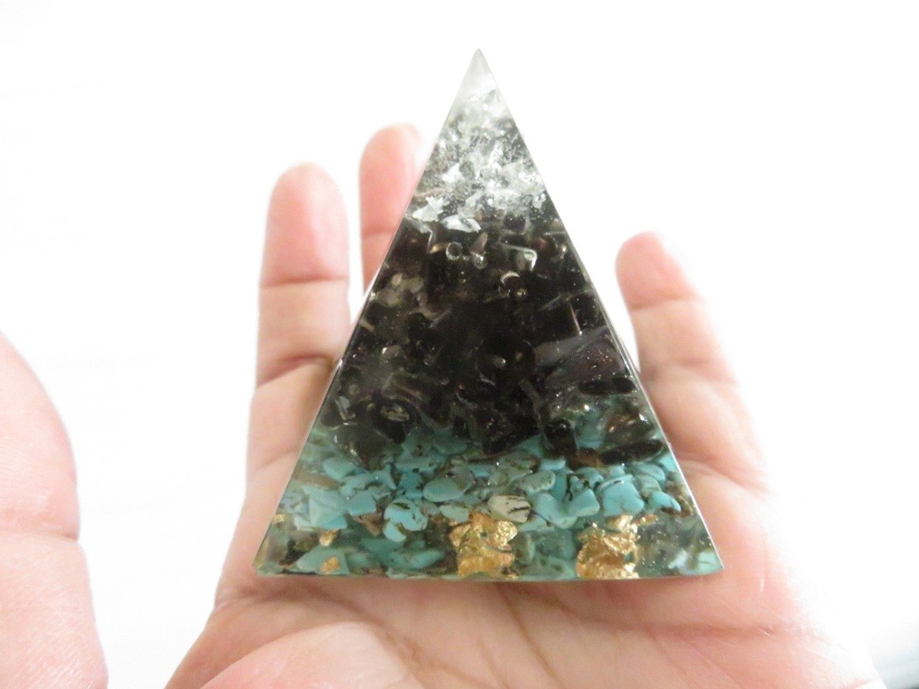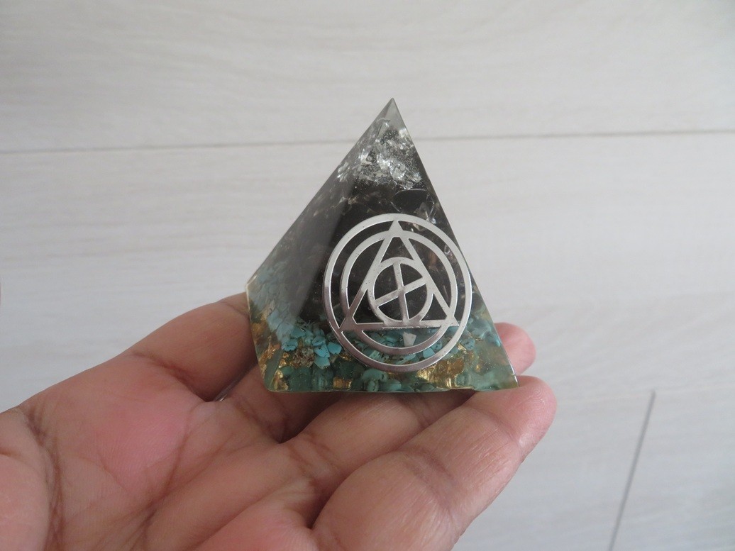 Très belle pyramide 100% fait main en résine incrusté de pierres naturelles Turquoise et Quartz fumé avec symbole sacré en cuivre argent - Dimension de la pyramide : 5.7 x 5.2 cm