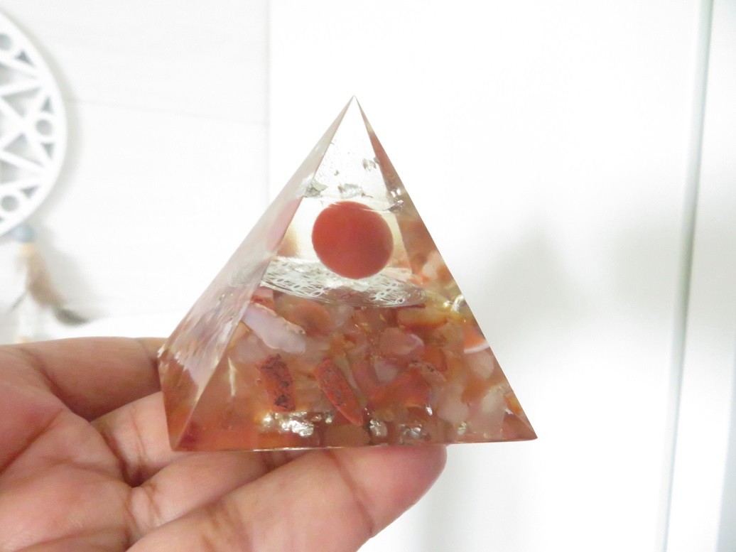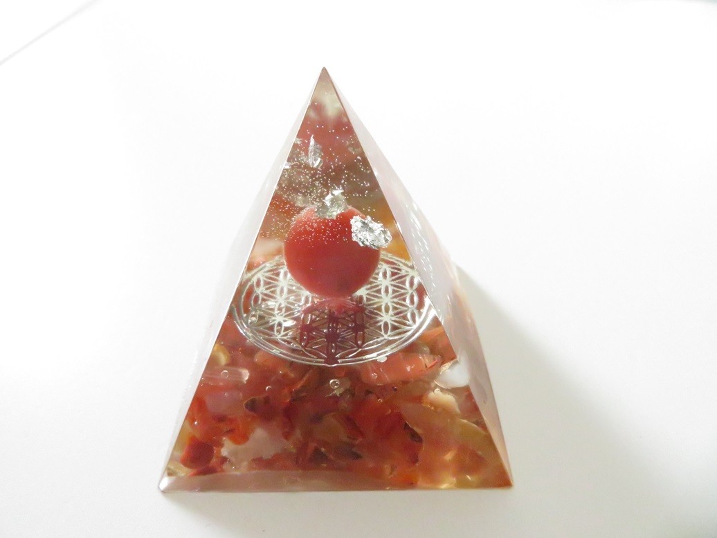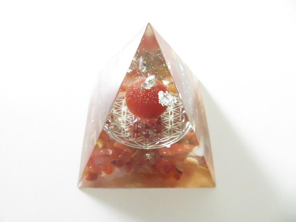 Très belle pyramide 100% fait main en résine incrusté de pierres naturelles Cornaline (boule et graviers) avec Fleur de vie en cuivre argent - Dimension de la pyramide : 6.5 x 6 cm