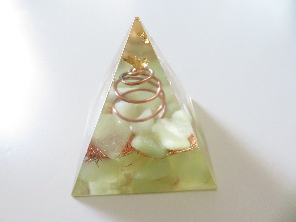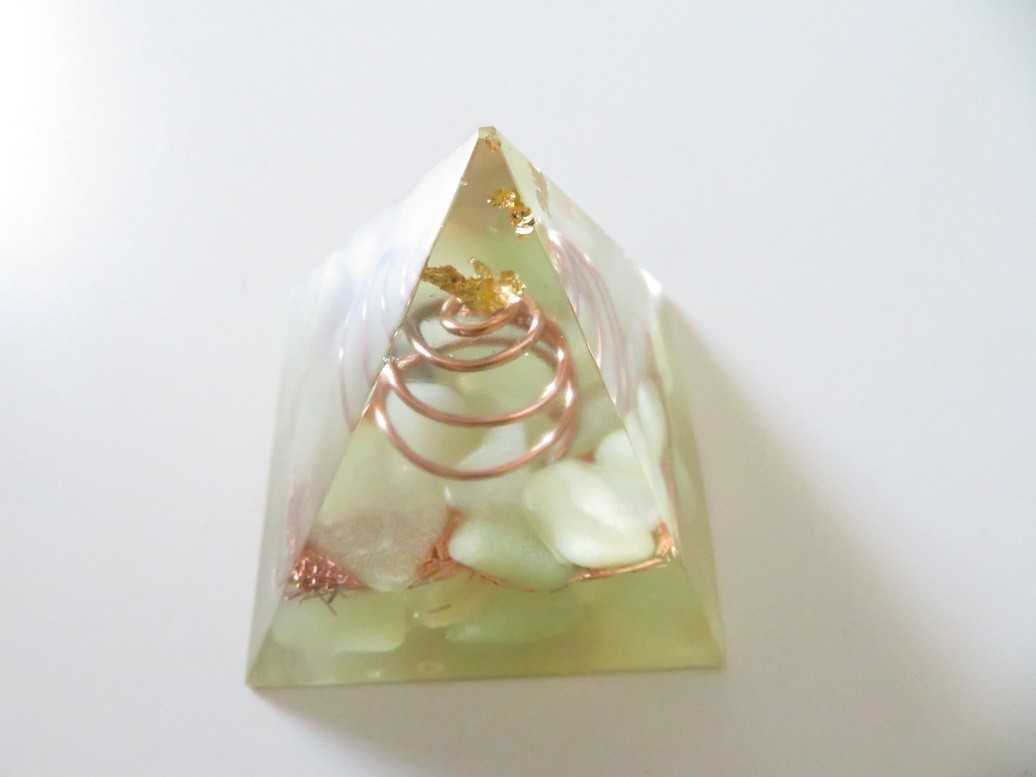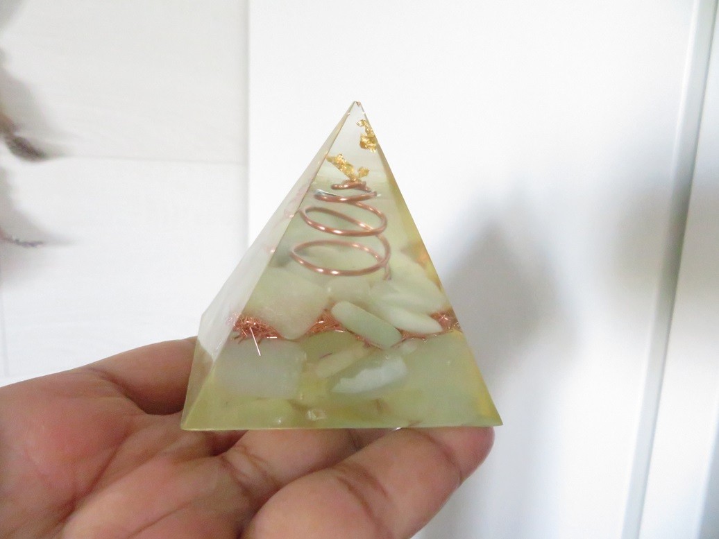 Très belle pyramide 100% fait main en résine incrusté de pierres naturelles Opale verte et cuivre- Dimension de la pyramide : 6.5 x 6 cm