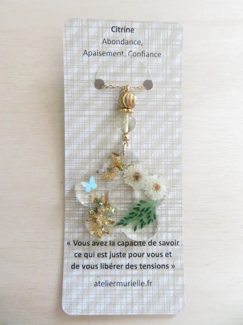 - Fleur faite en résine incrusté de fleurs et feuille séchées, flocons or et papillon
