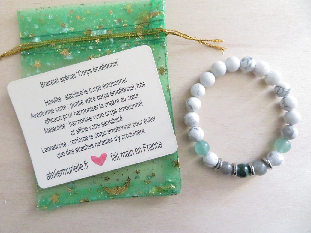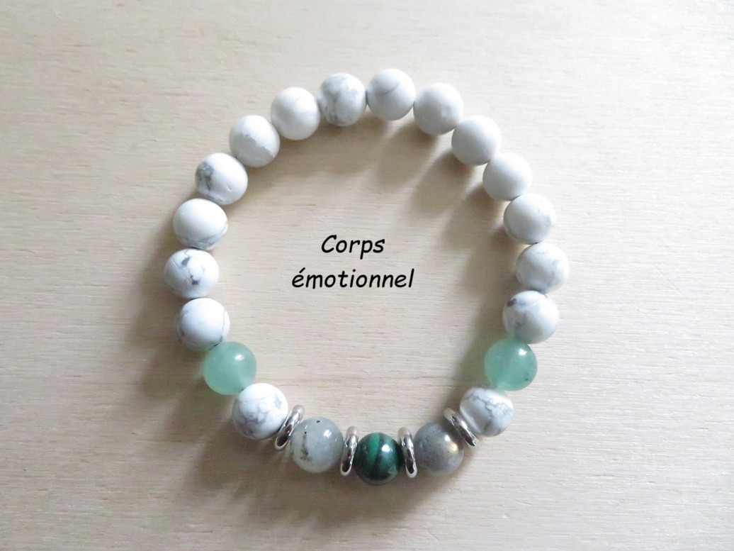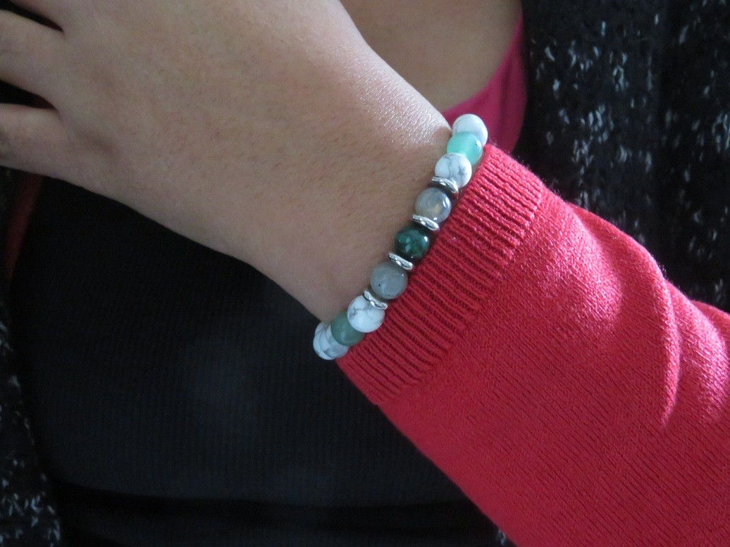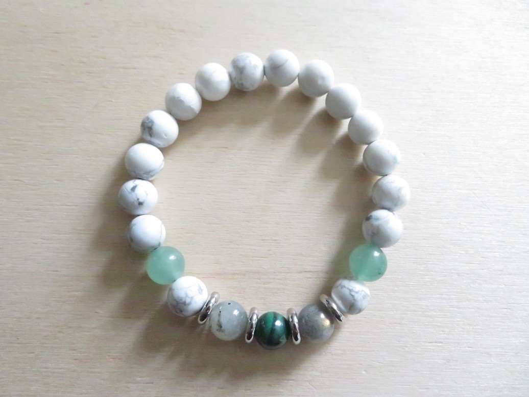 Bracelet en pierres naturelles Howlite (8 mm), Aventurine verte (8 mm), Labradorite (8 mm), Malachite (8 mm) avec entretoises en acier inoxydable argent monté sur un fil stretch